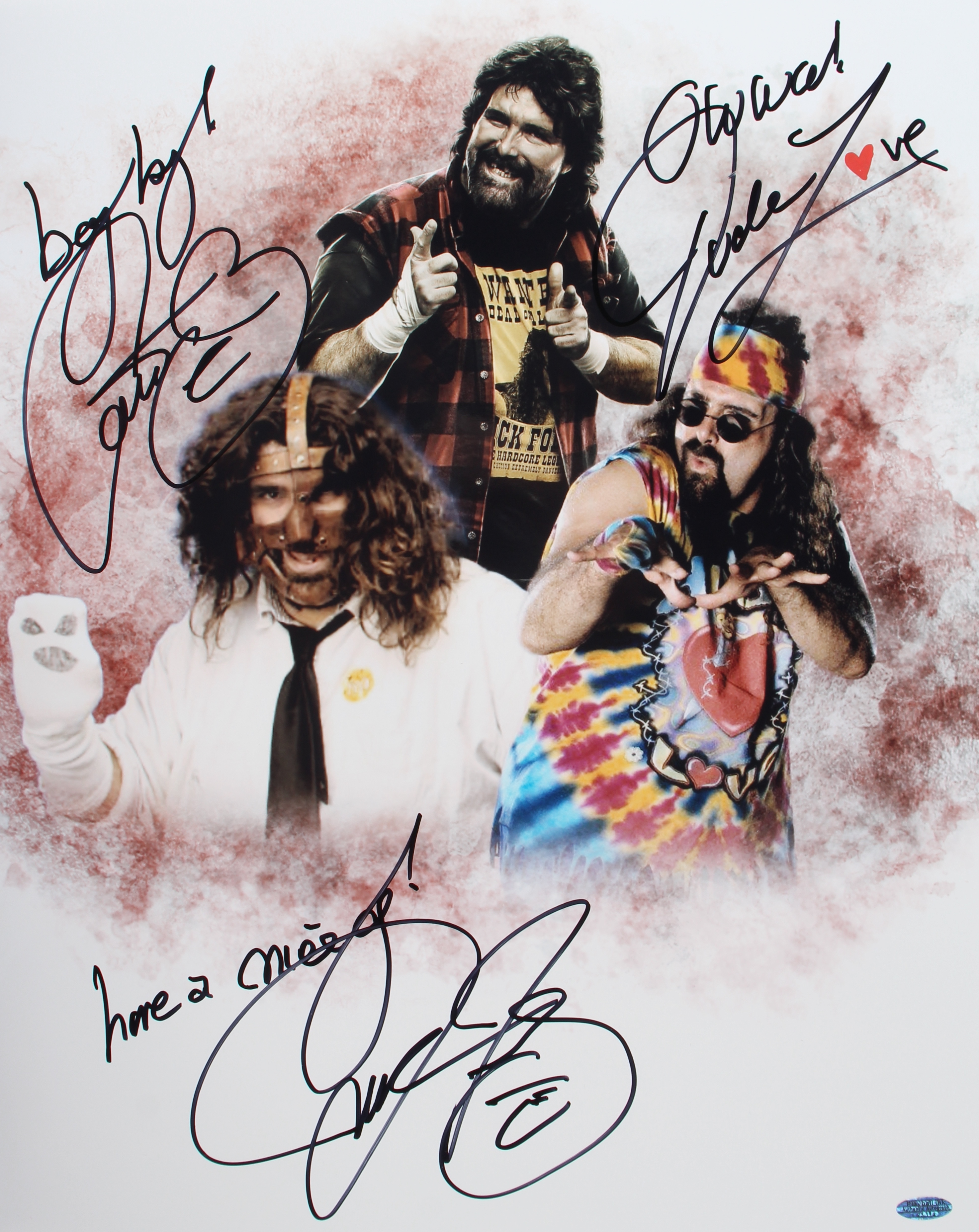Photo measures 16" x 20" in size. Hand-signed and inscribed by Mick Foley (HOF).