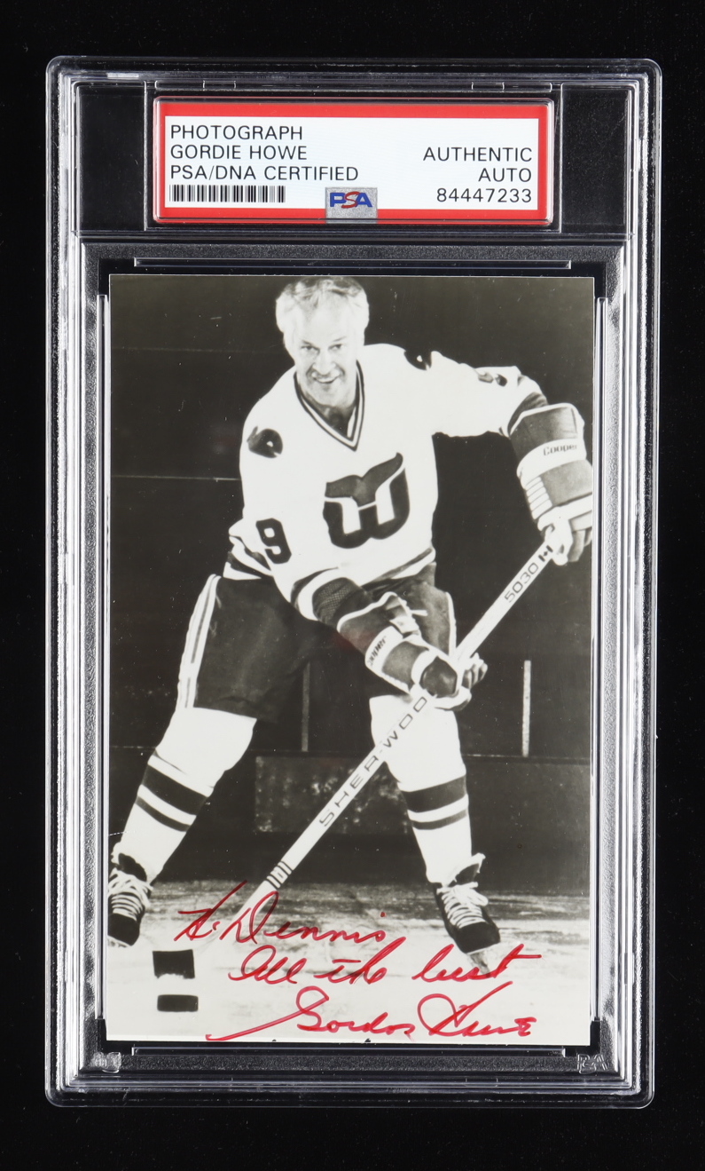 Photo measures 3.5" x 5.5" in size and has been hand-signed and inscribed by Gordie Howe (Hartford Whalers, HOF). Please note, the inscription is personalized "To Dennis".