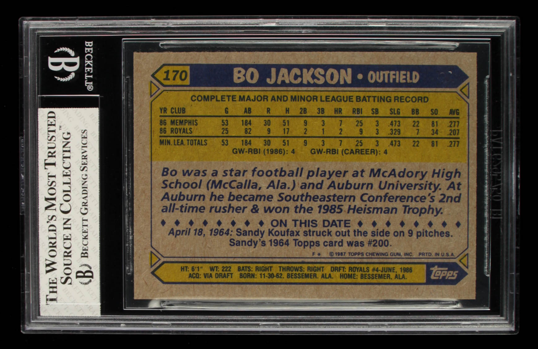Bo Jackson 1987 Topps #170 RC (BGS 8)