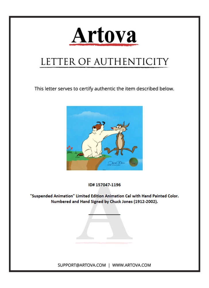 Own this amazing piece based on the original line image hand drawn and hand-inked on paper by Mr. Jones. "Suspended Animation" is a limited edition animation cel from a sold out edition with hand-painted color on sericel outline, numbered and hand-signed by Chuck Jones (1912-2002). The sericel comes with a brilliant full-color background. Measures approximately 12.5" x 10.5" (sericel and background).