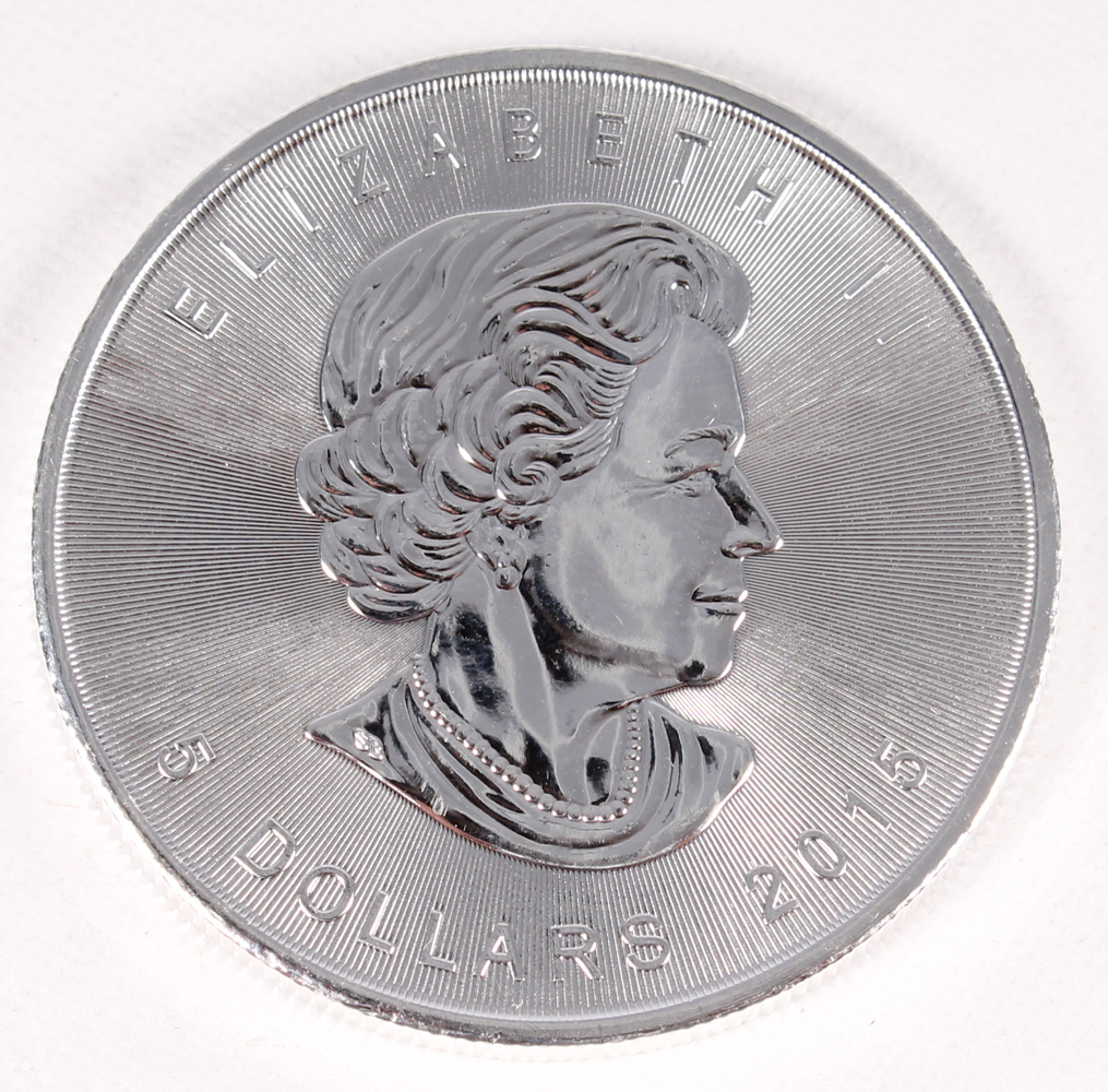 The Canadian Silver Maple Leaf is the flagship silver bullion coin produced each year by the Royal Canadian Mint. The primary image on the 2015 coin features an intricately detailed maple leaf, with every detail easily visible. On the opposite side of the coin, the effigy of Her Majesty Queen Elizabeth II is again featured as it is on numerous other coins designed by the mint each year. The image of Queen Elizabeth is based upon a 2003 rendering by Canadian portrait artist Susanna Blunt.