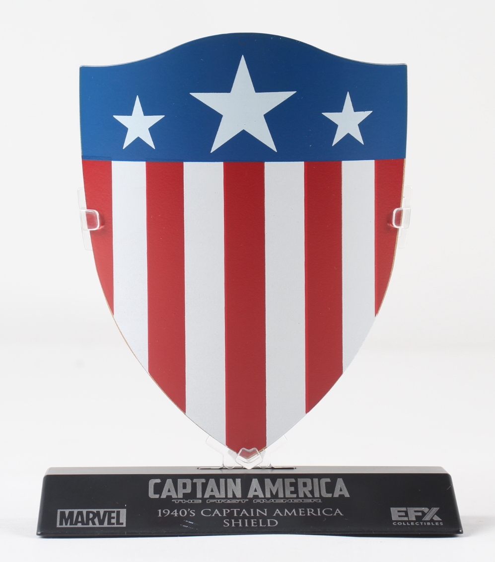 EFX miniature 1:6 scale "Captain America: The First Avenger" 1940s shield prop replica. Measures approximately 5.5" tall with the stand. Created using the original digital files and reference materials from Marvel Studios. Please note, the item is unsigned.