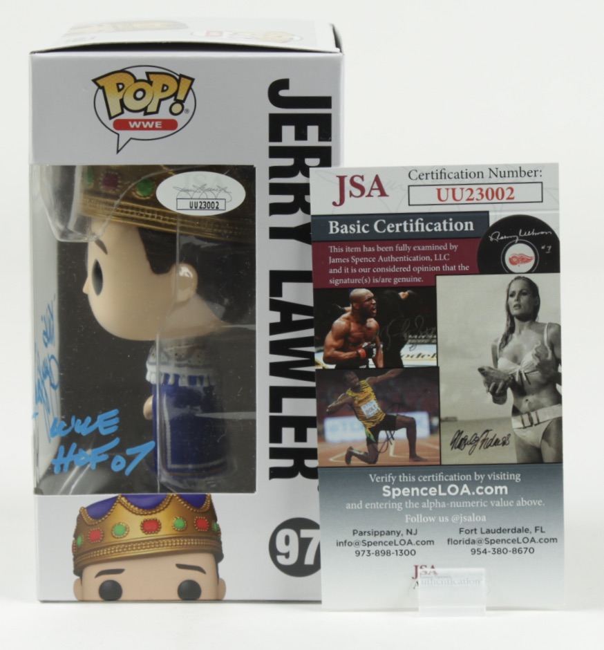 Funko Pop! vinyl figure measures approximately 4" tall and has been hand-signed and inscribed on the packaging by Jerry Lawler (HOF).