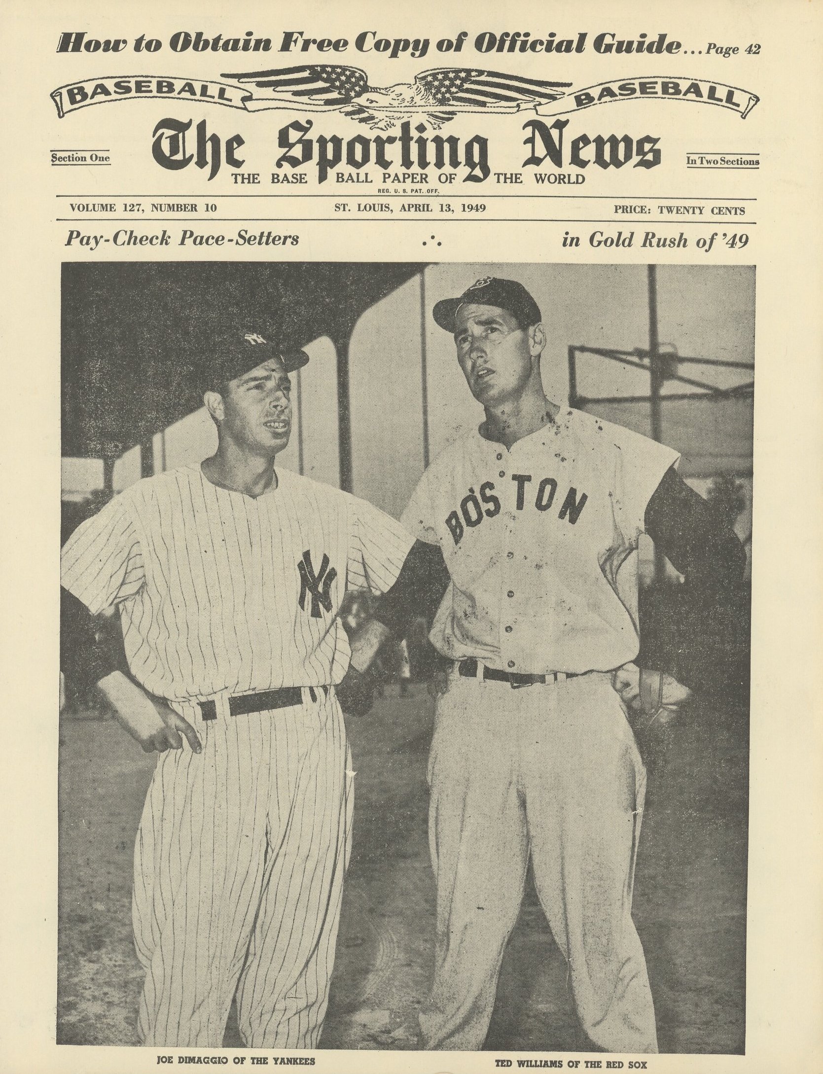 April 13, 1949 cover page copy of The Sporting News newspaper measures 8" x 10" in size and features a photo of Joe DiMaggio (D. 1999, New York Yankees, HOF) and Ted Williams (D. 2002, Boston Red Sox, HOF). Please see photos for more details regarding the condition of the copy.