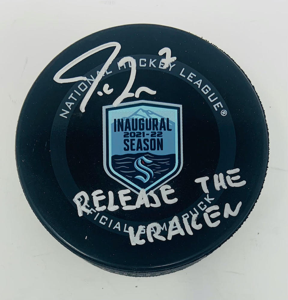 Jordan Eberle Signed Kraken Inaugural Season Logo Hockey Puck Inscribed "RELEASE THE KRAKEN" (Fanatics)