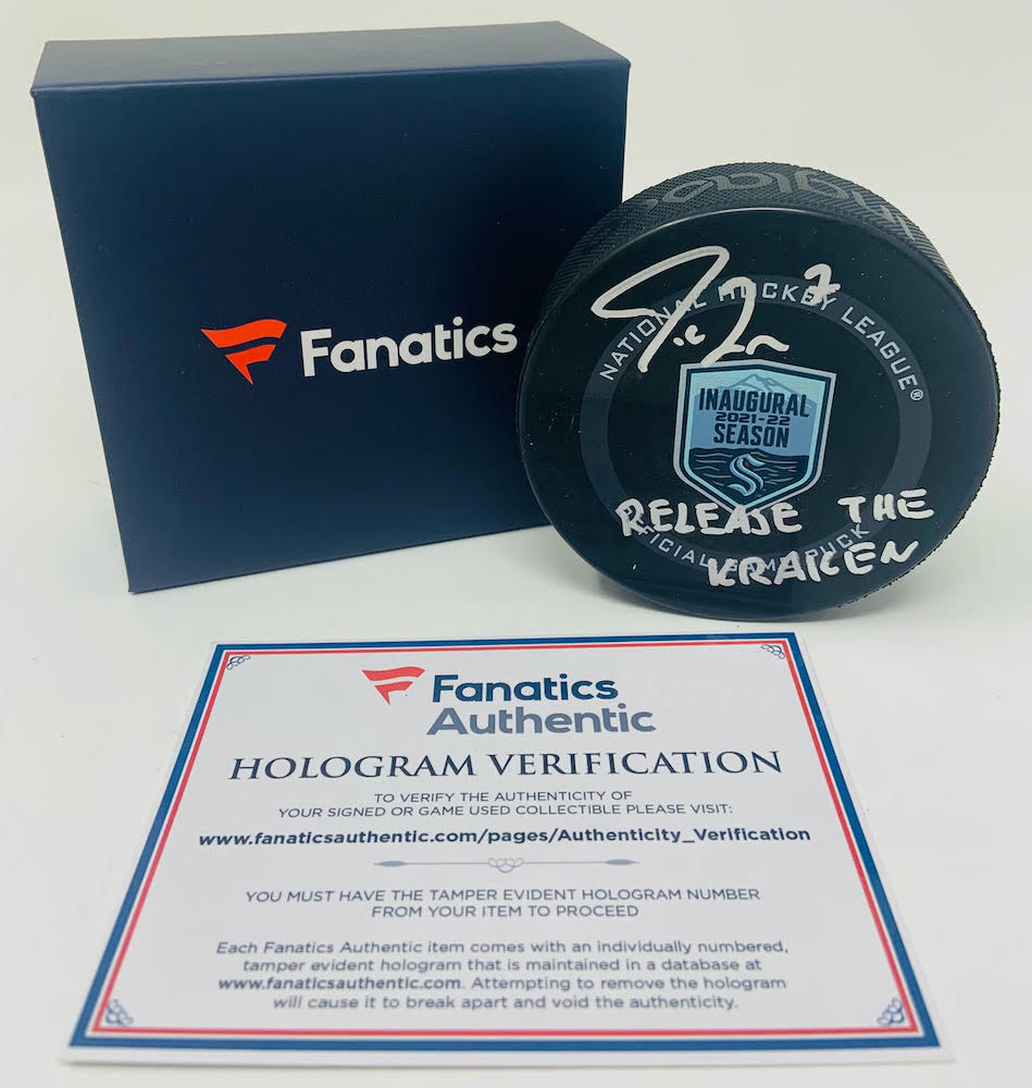 This Seattle Kraken logo puck has been personally hand-signed by Jordan Eberle with the inscription "Release The Kraken." It is officially licensed by the National Hockey League and comes with an individually numbered, tamper-evident hologram from Fanatics Authentic. To ensure authenticity, the hologram can be reviewed online. This process helps to ensure that the product purchased is authentic and eliminates any possibility of duplication or fraud.