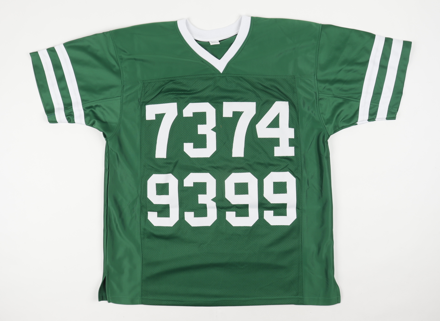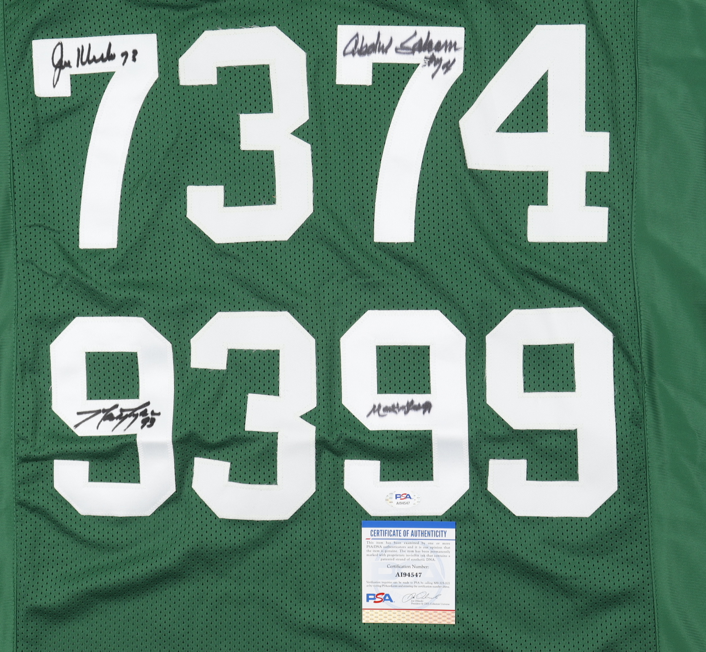 Custom on-field style jersey. Everything is sewn on, size XL. Hand-signed by (4) including Joe Klecko, Abdul Salaam, Mark Gastineau, and Marty Lyons.