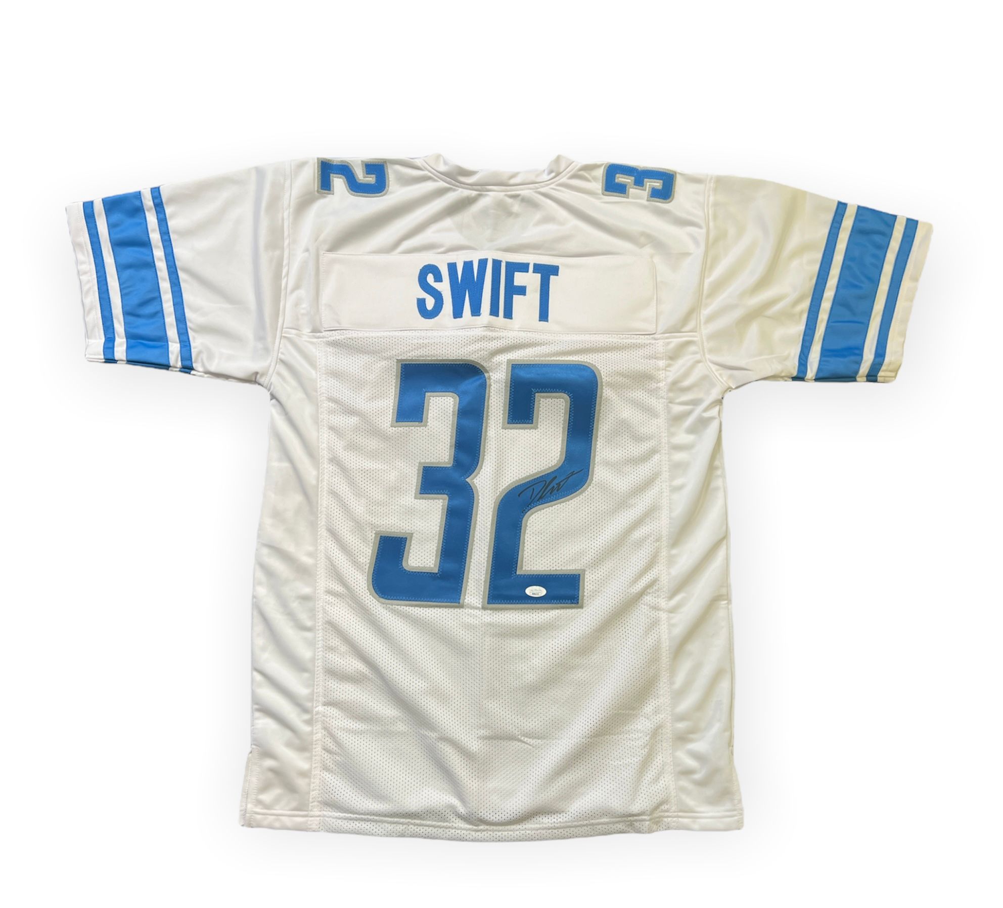 Custom on-field style jersey. Everything is sewn on, size XL. Has been hand-signed by D'Andre Swift.
