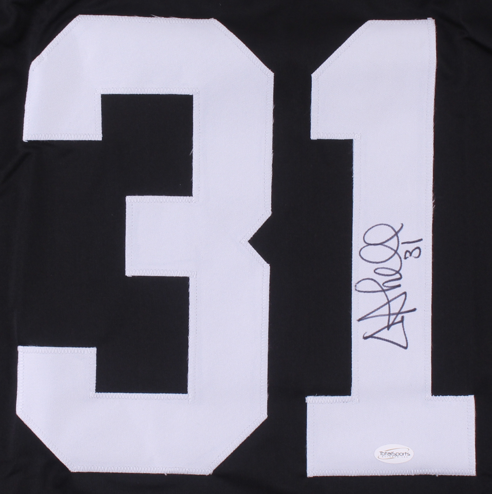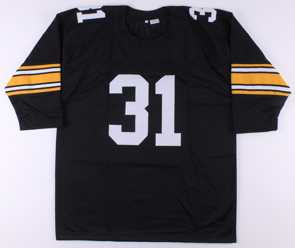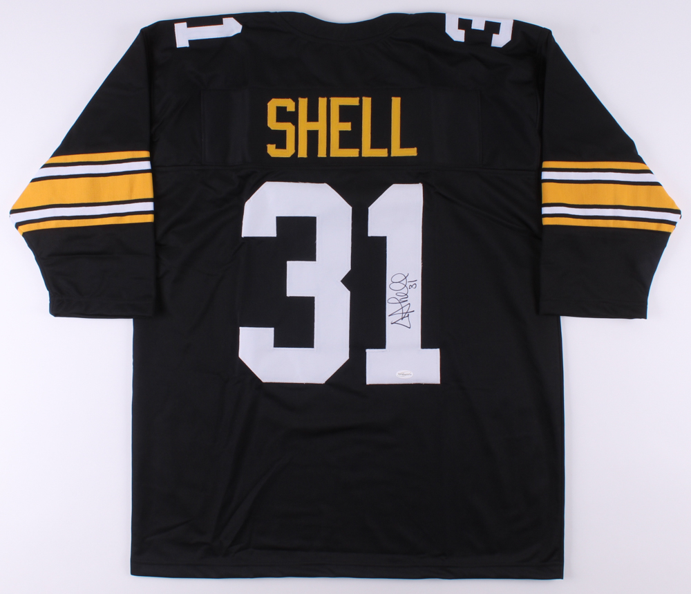 Custom on-field style jersey. Everything is sewn on, size XL. Hand-signed by Donnie Shell.