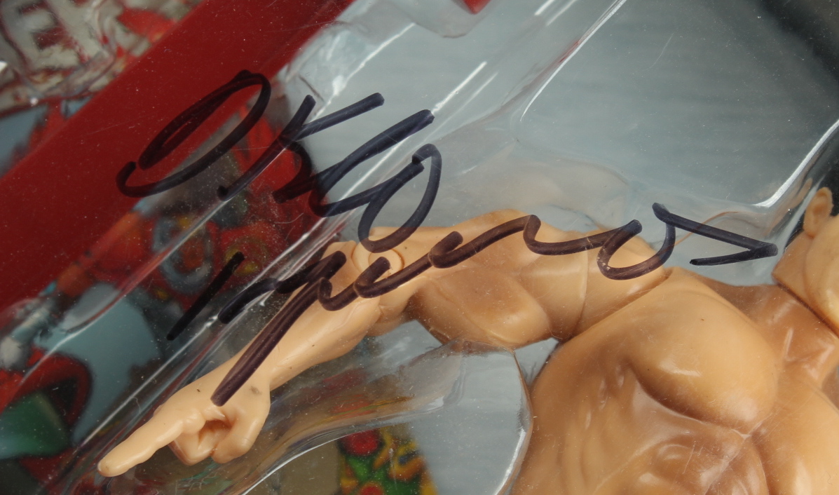 WCW Bruisers Action Figure measures approximately 6" in height and the packaging has been hand-signed by Disco Inferno. Includes original packaging as shown. Please note, there is a sticker on packaging.