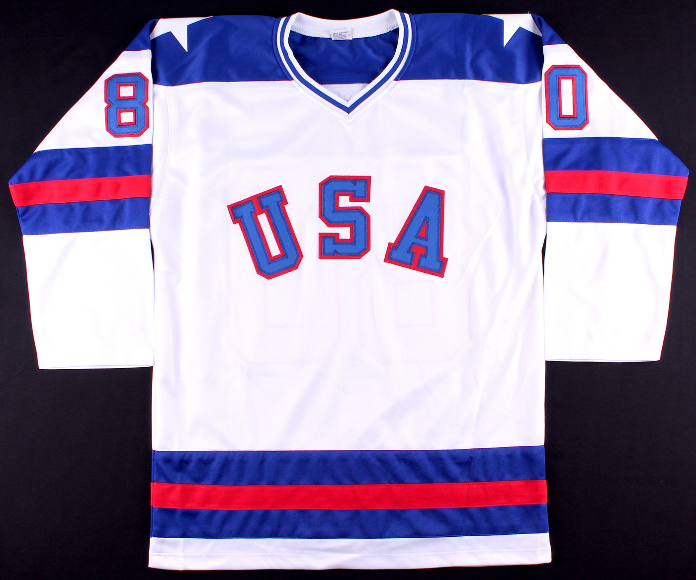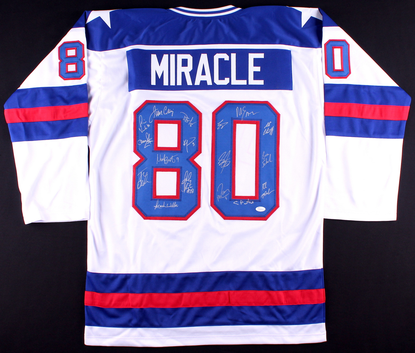 Custom on-ice style jersey. Everything sewn on, size XL. Hand-signed in silver paint-pen by (17) members of the 1980 USA Hockey Team. The autographs include Mike Eruzione, Jim Craig, Ken Morrow, Jack O'Callahan, Rob McClanahan, Dave Silk, Buzz Schneider, Mark Wells, Neal Broten, Dave Christian, John Harrington, Phil Verchota, Mike Ramsey, Steve Janaszak and others.