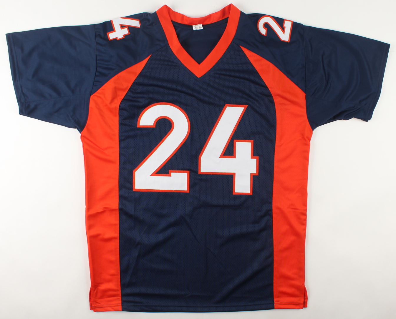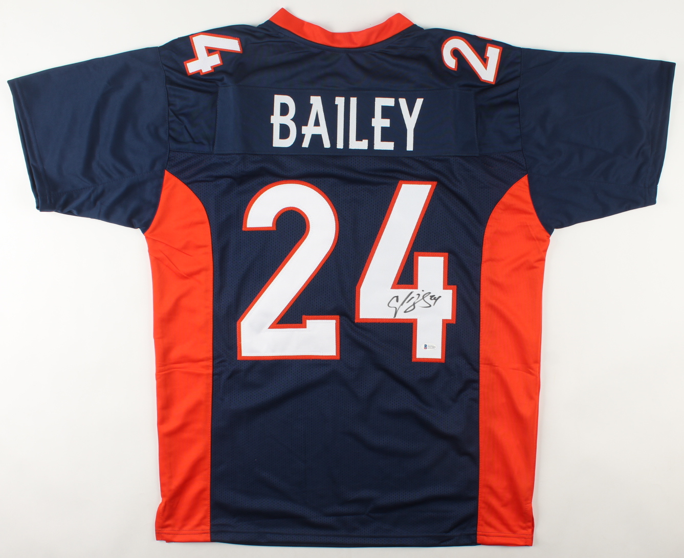 Custom on-field style jersey. Everything sewn on, size XL. Hand-signed by Champ Bailey (HOF).