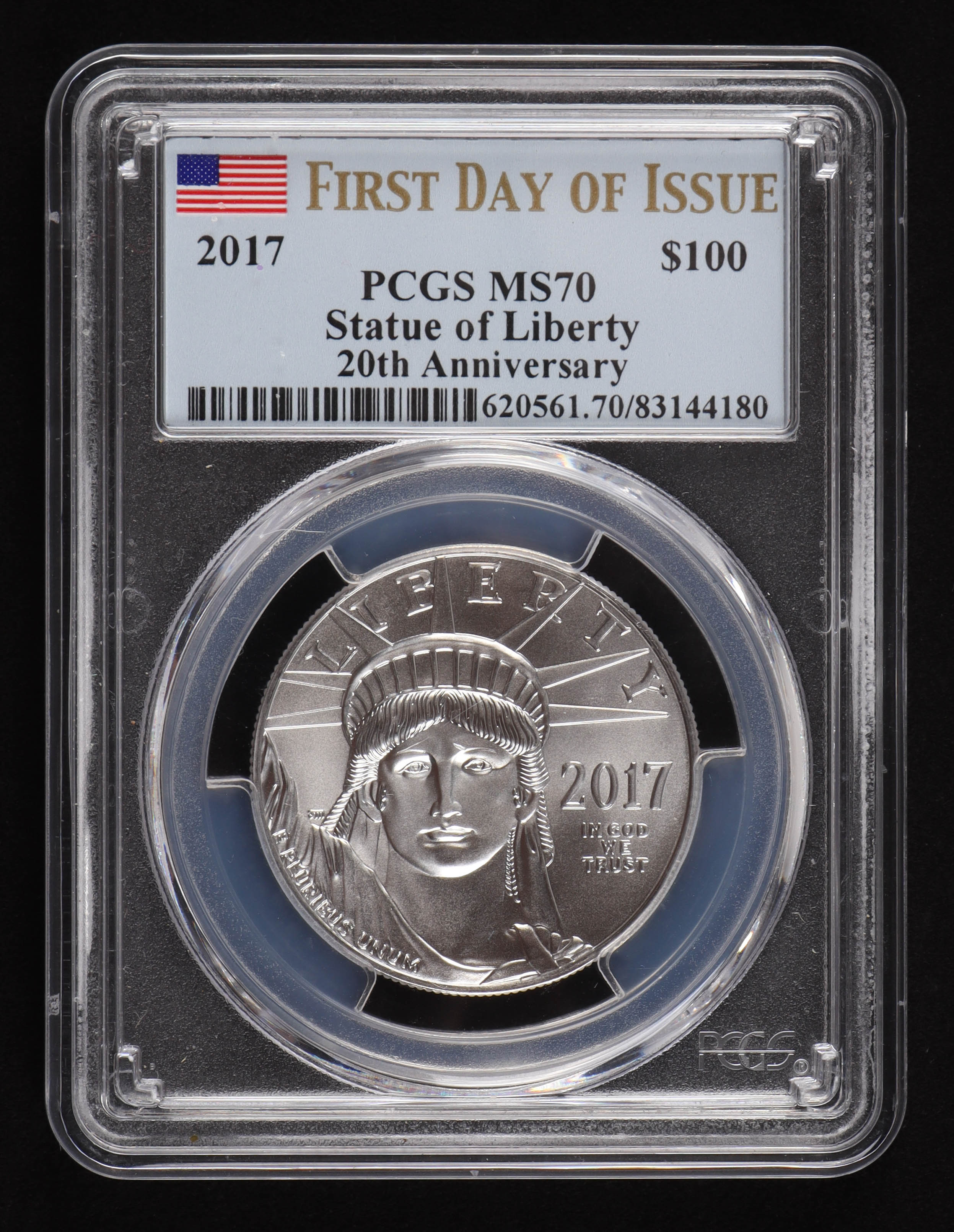 2017 Statue of Liberty 20th Anniversary $100 One Hundred-Dollar - 1 Oz Platinum - 1st Day of Issue - Coin (PCGS MS 70)
