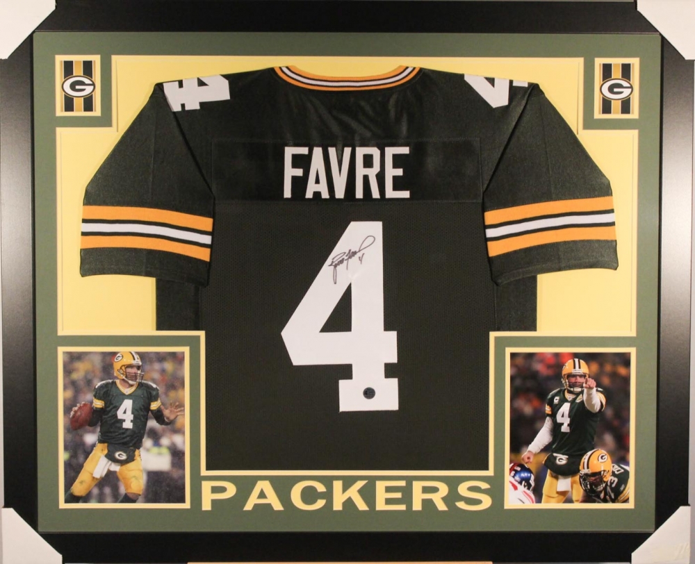 Custom framed display measures 35" x 43" in size. Features a jersey which has been hand-signed in black felt-tip pen by Brett Favre (HOF).