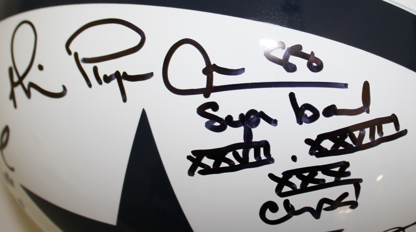Cowboys full-size replica helmet. Hand-signed and inscribed in black felt-tip pen by Troy Aikman (HOF), Emmitt Smith (HOF) and Michael Irvin (HOF).