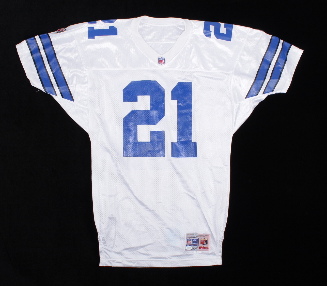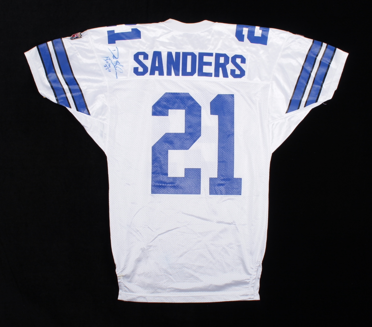 Wilson on-field style jersey. Everything printed on, size 44. Hand-signed by Deion Sanders (Dallas Cowboys, HOF).