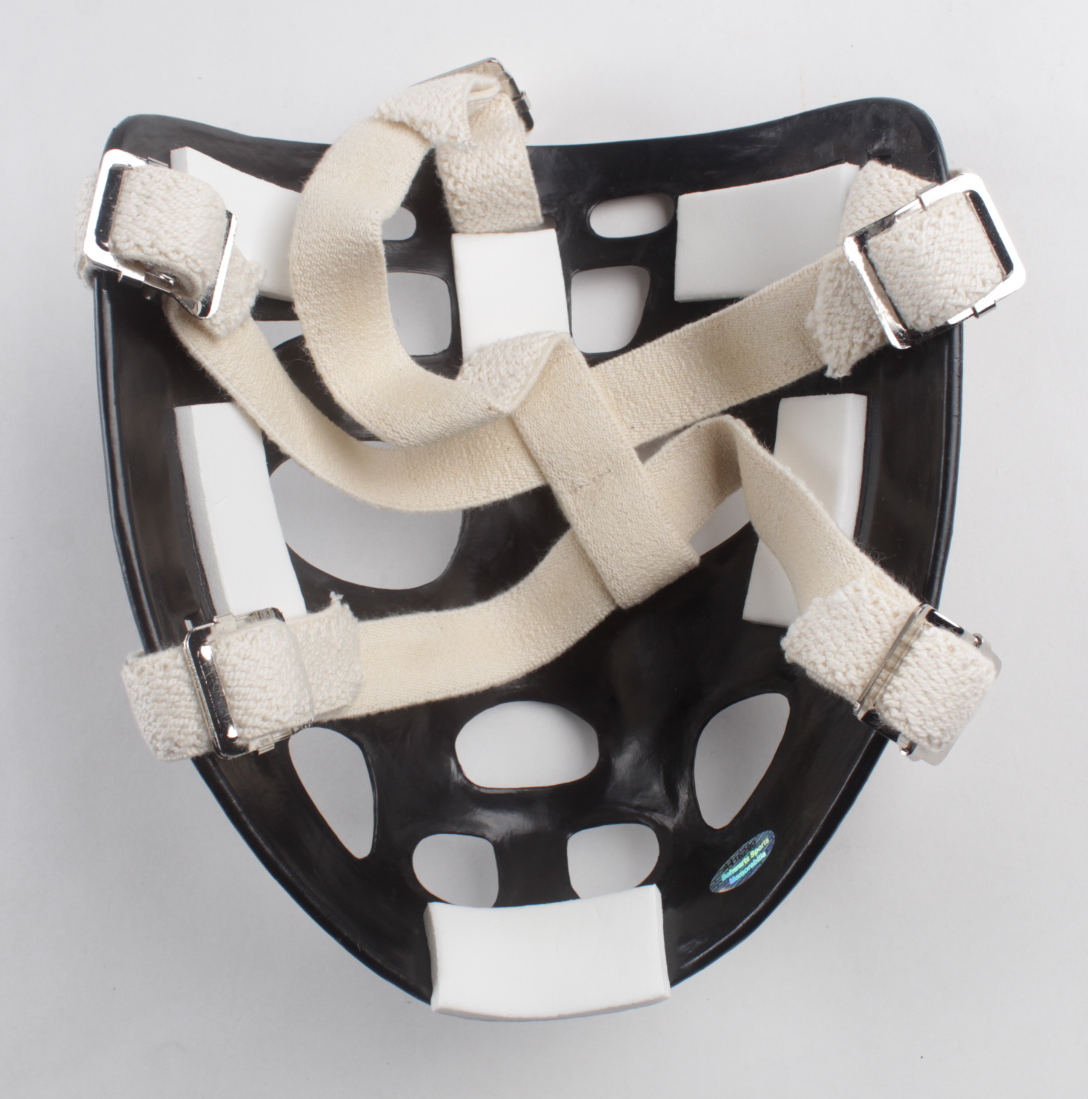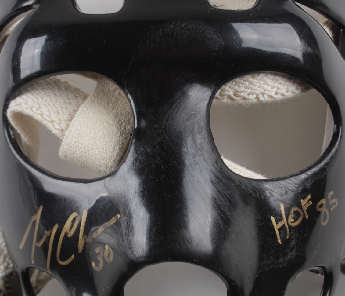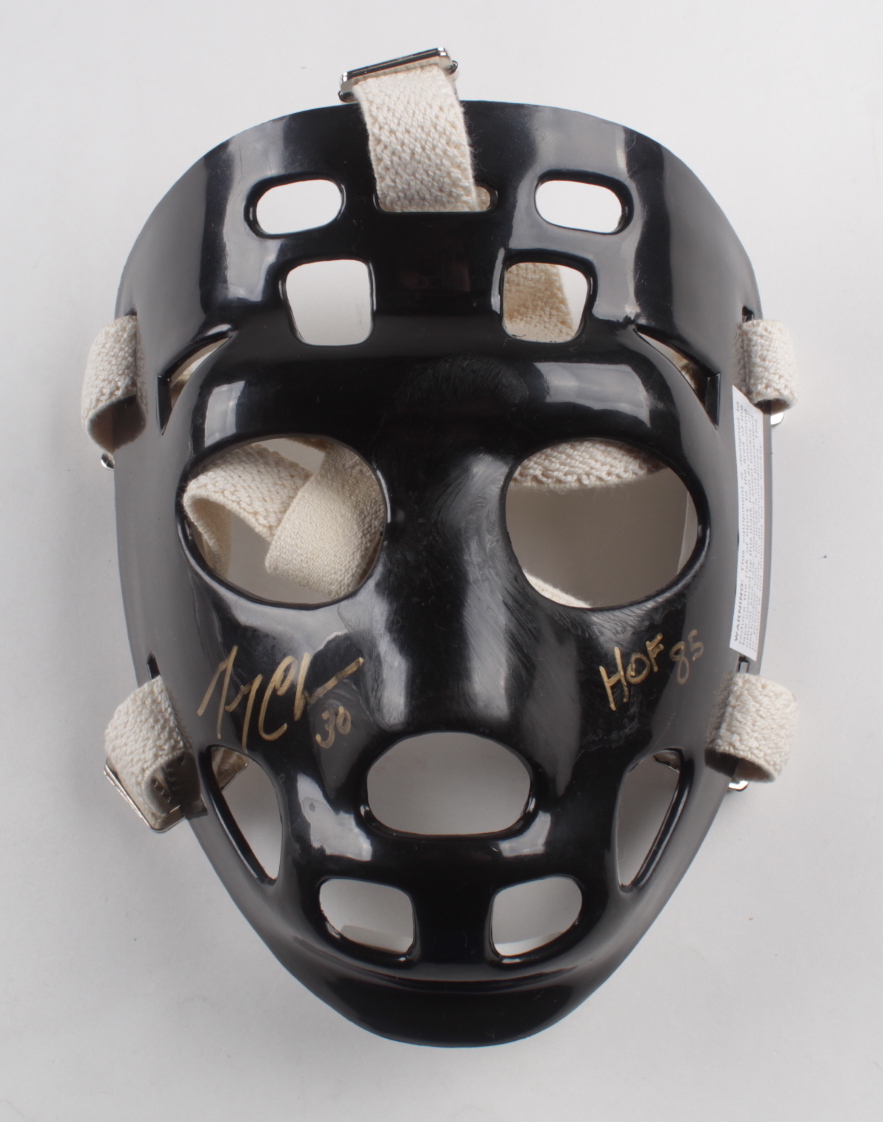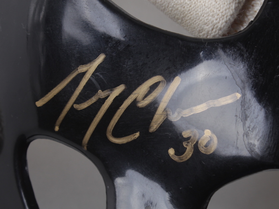Replica hockey goalie mask has been hand-signed and inscribed by Gerry Cheevers (Boston Bruins, HOF).