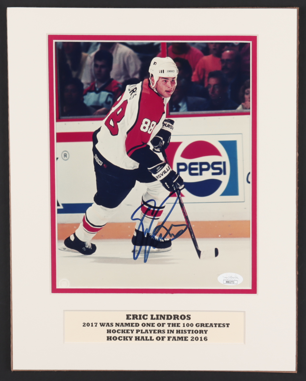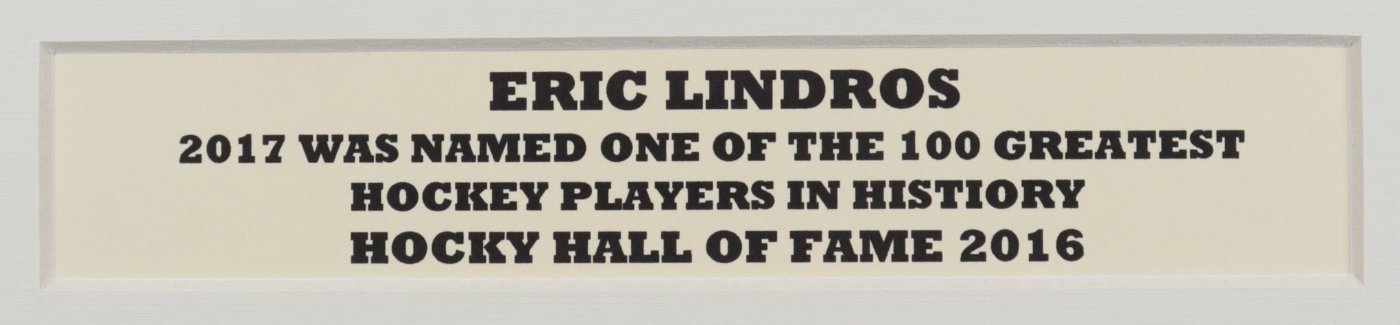 Custom matted display measures approximately 11" x 14" in size and features a photo that has been hand-signed by Eric Lindros (Philadelphia Flyers, HOF).