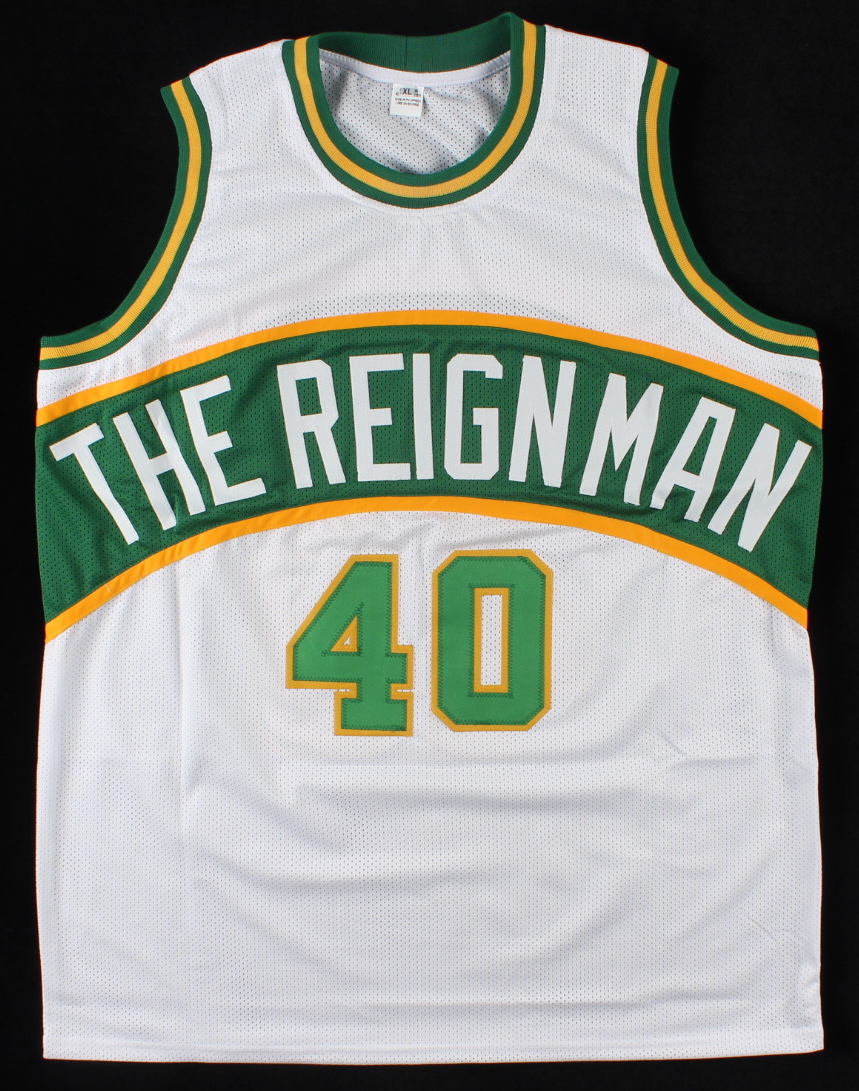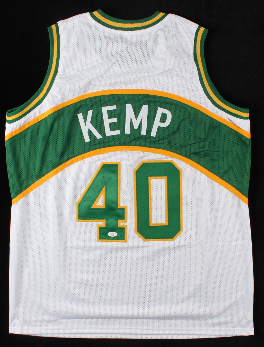 Custom on-court style jersey. Everything is sewn on, size XL. Hand-signed by Shawn Kemp.