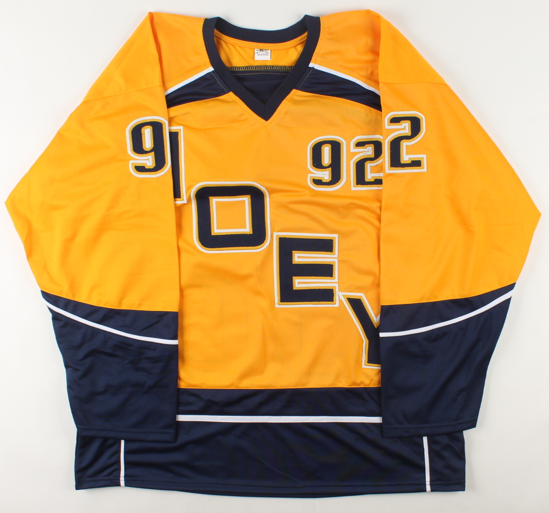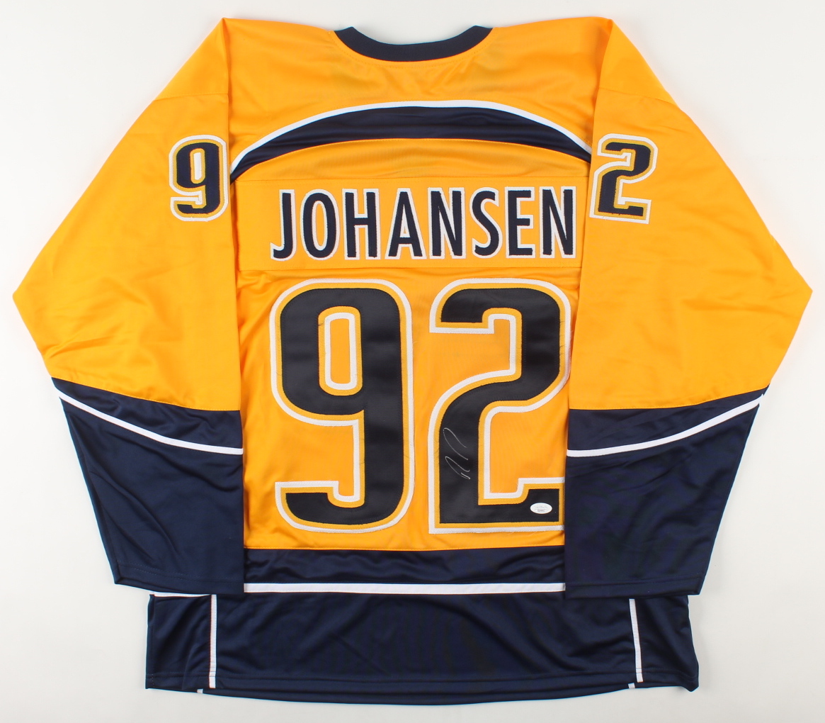 Custom on-ice style jersey. Everything sewn on, size XL. Hand-signed by Ryan Johansen.