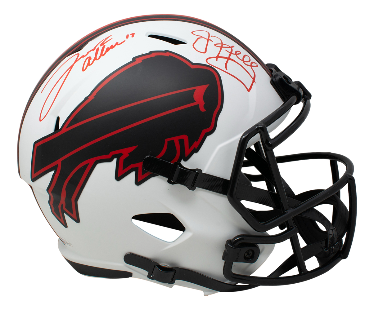 Riddell Buffalo Bills full-size replica Lunar eclipse alternate speed helmet. Hand-signed by Jim Kelly (HOF) and Josh Allen.