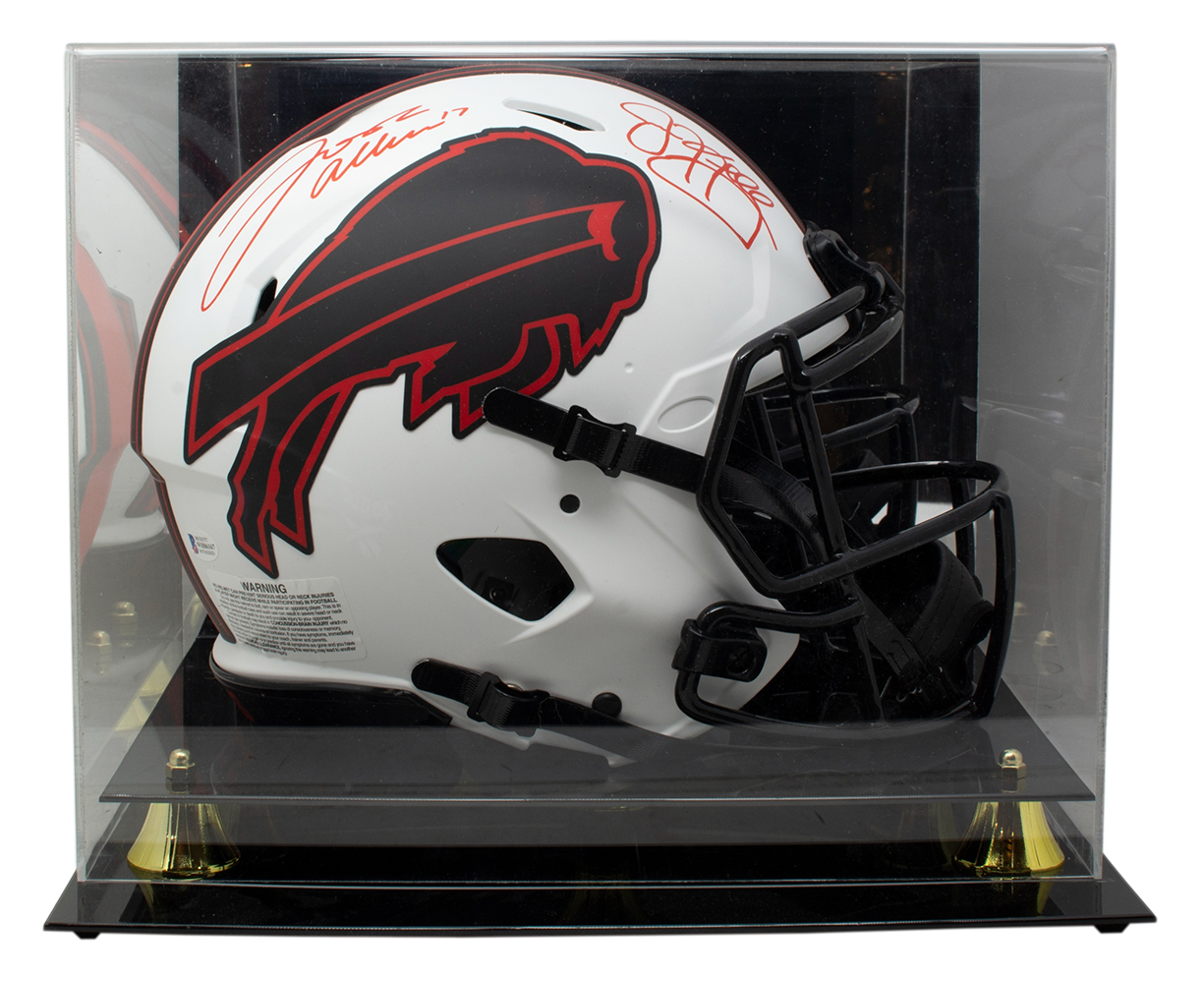 Riddell Buffalo Bills full-size authentic on-field Lunar Eclipse Alternate Speed helmet. Hand-signed by Josh Allen and Jim Kelly (HOF). Display case included as shown.
