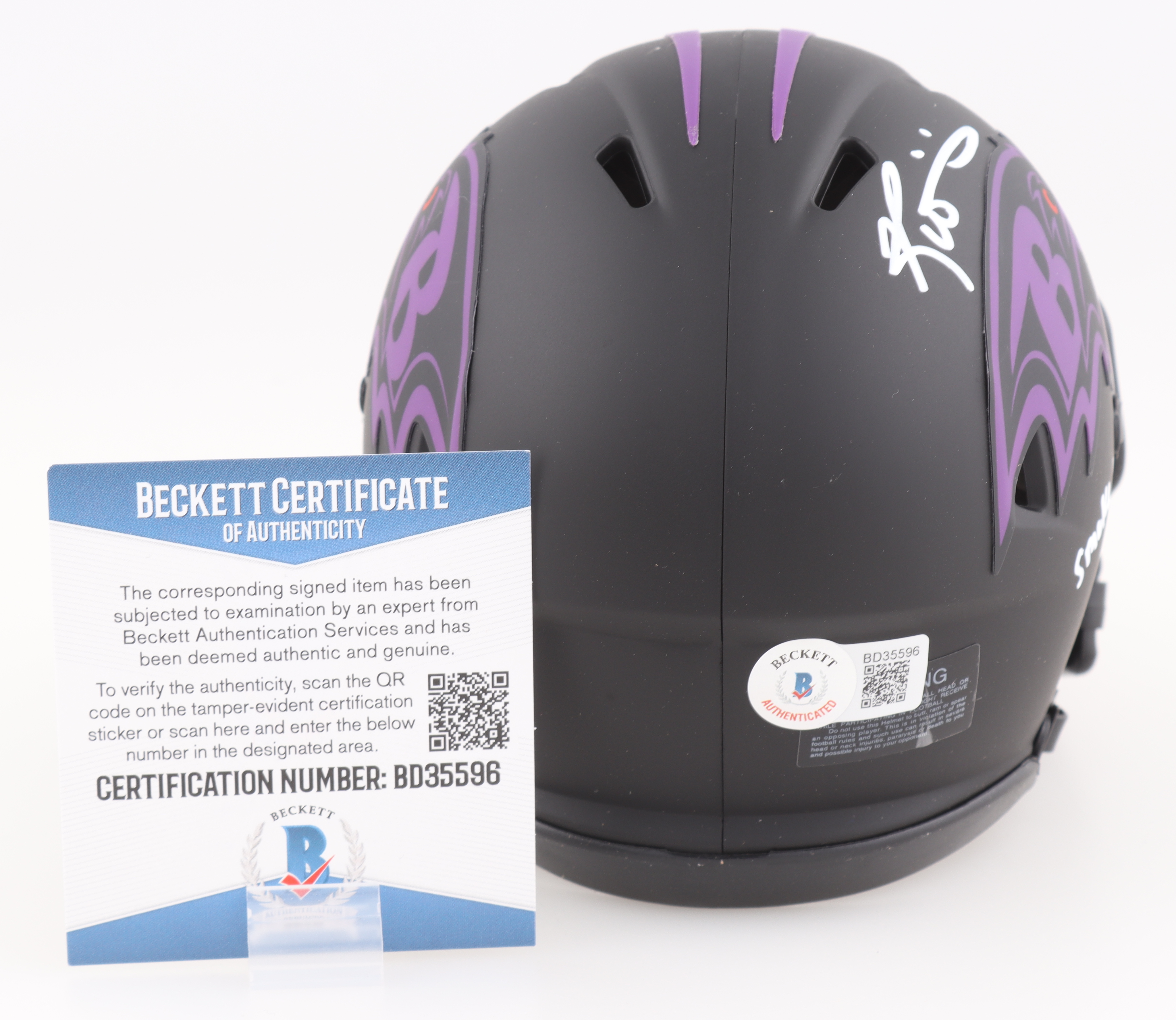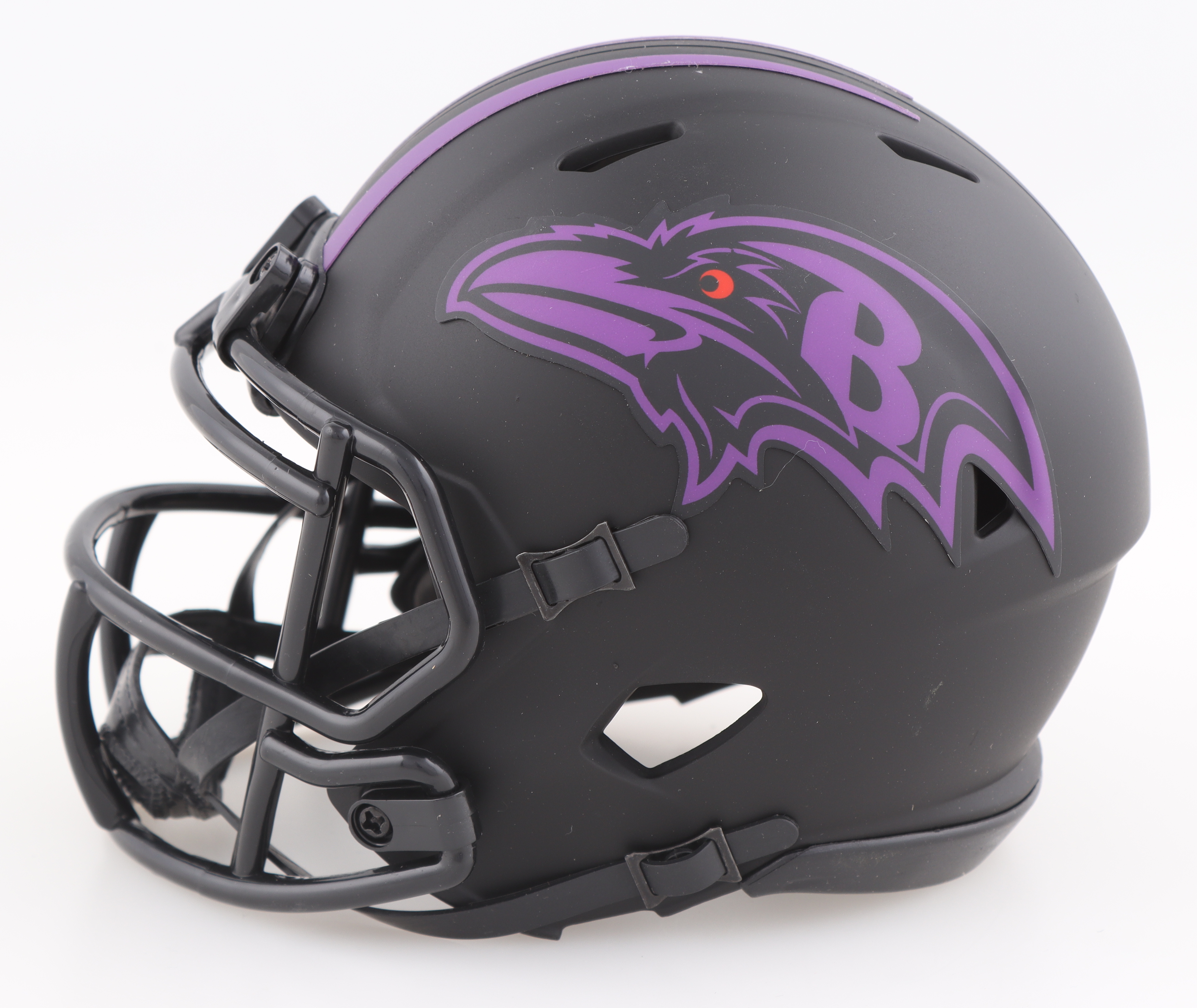 Riddell Baltimore Ravens Eclipse Alternate speed mini helmet. Hand-signed and inscribed by Ricky Williams.