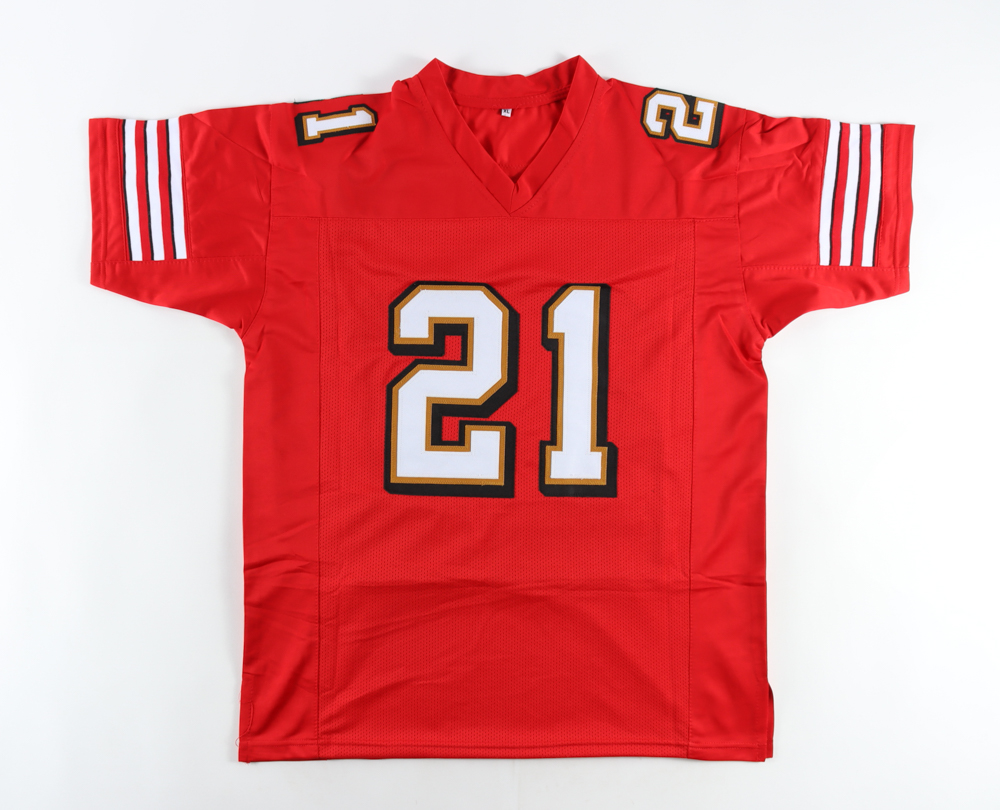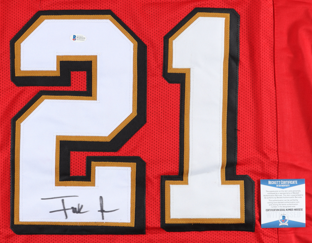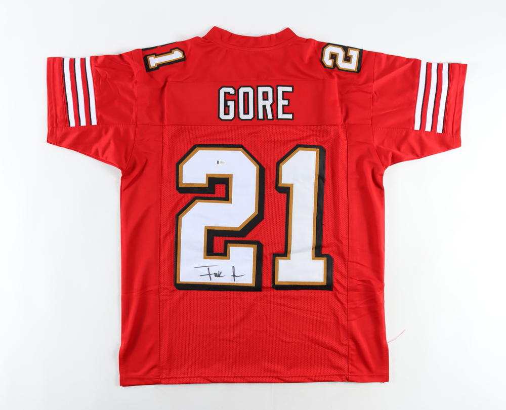 Custom on-field style jersey. Everything is sewn on, size XL. Hand-signed by Frank Gore. Please note, there is light staining on the reverse numbers and the stitching is imperfect on the front numbers.