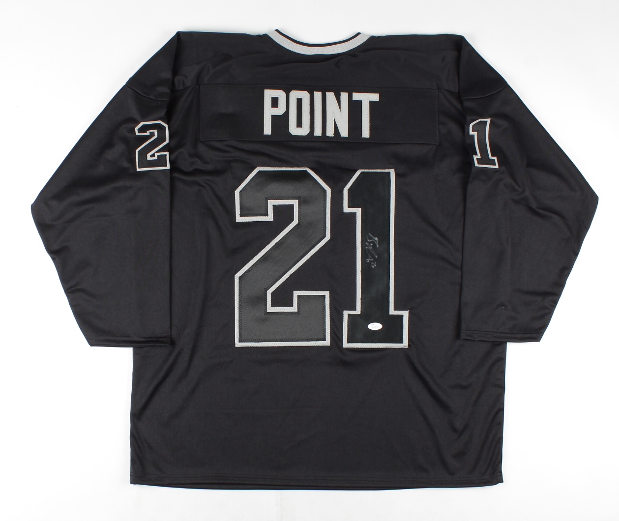 Custom on-ice style jersey. Everything sewn on, size XL. Hand-signed by Brayden Point.