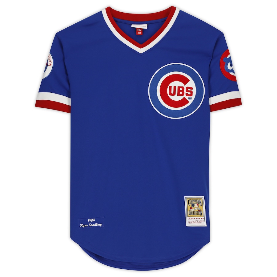 Mitchell & Ness on-field style jersey. Everything is sewn on, size 44. Hand-signed and inscribed by Ryne Sandberg (Chicago Cubs, HOF).