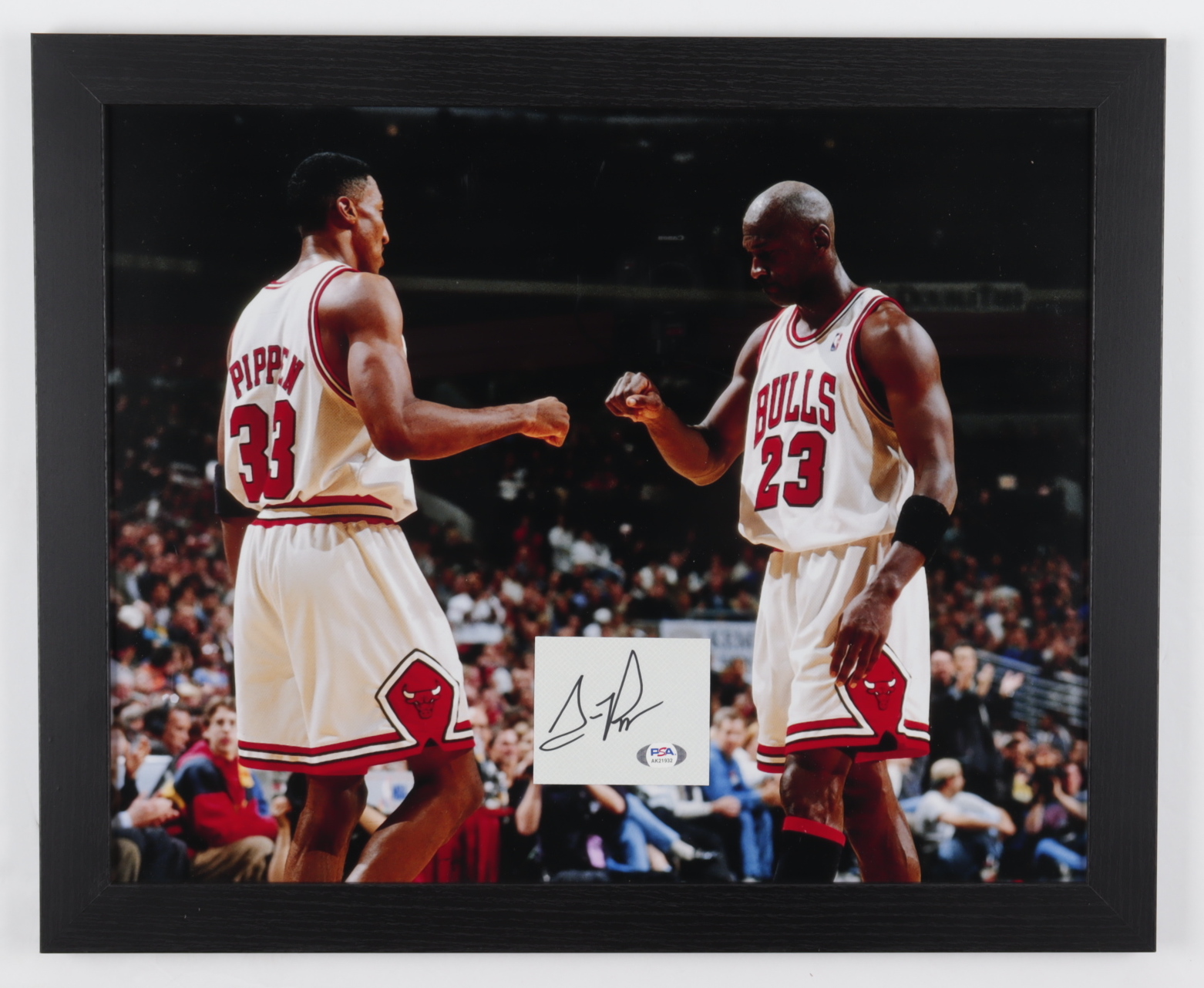 Custom frame measures 18" x 22" in size and features a 3" x 3" cut that has been hand-signed by Scottie Pippen (Chicago Bulls, HOF).