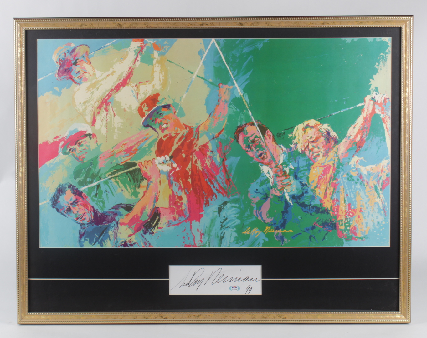 Custom frame measures approximately 28" x 36" in size and features a golf print, as well as a 2.5" x 8" cut that has been hand-signed and inscribed by LeRoy Neiman (D. 2012).