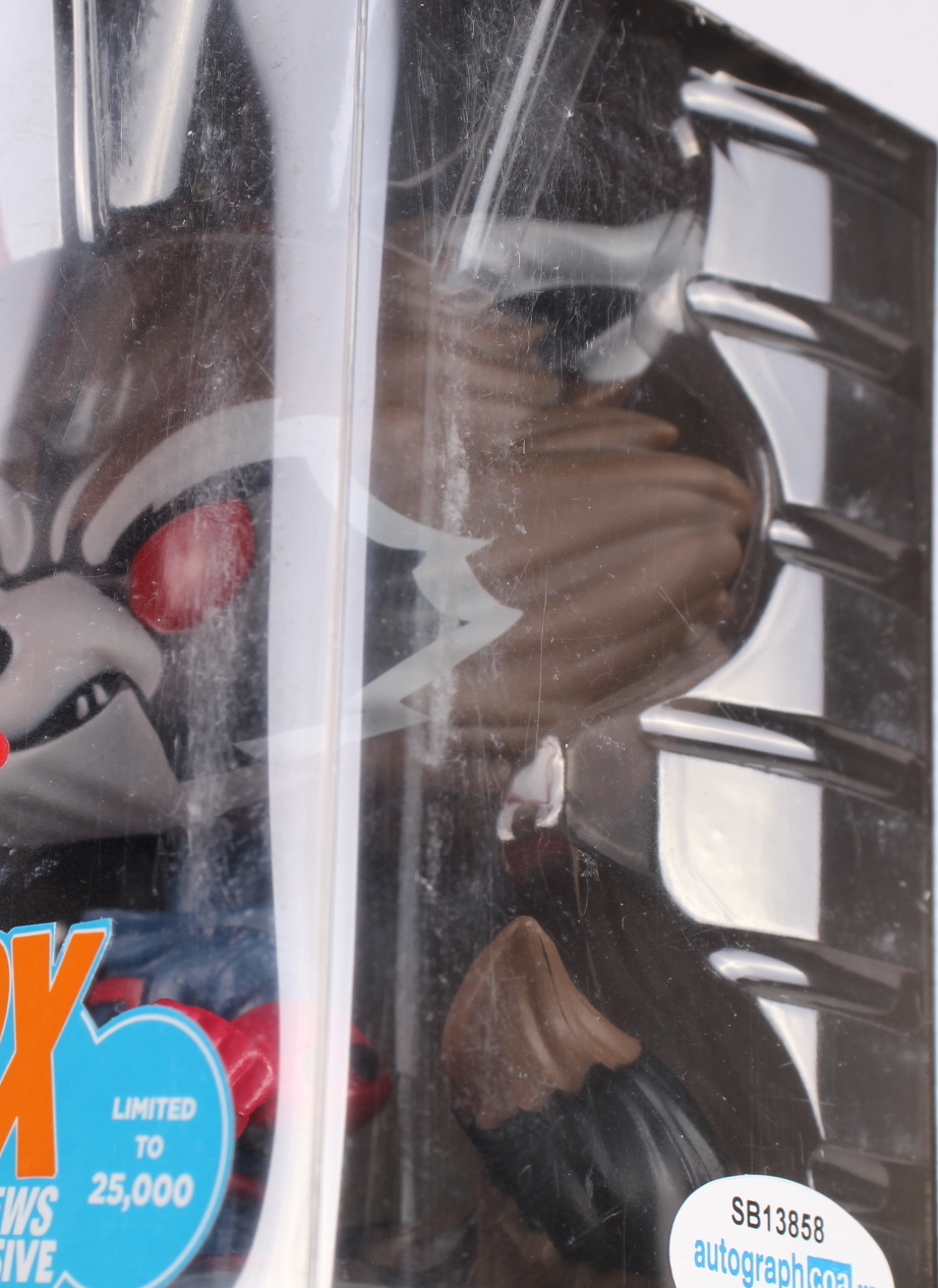 Vinyl figure measures approximately 4" tall and has been hand-signed on the packaging by Bradley Cooper (Rocket). This figure is limited edition numbered #/25,000. Please note, the box shows signs of handling and wear. See photos for details regarding the condition of the box.