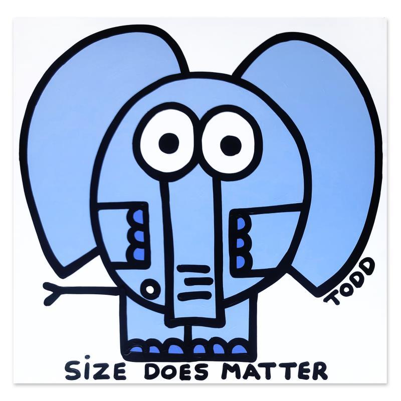 "Size Does Matter" is an original acrylic painting on gallery wrapped canvas by Todd Goldman. The piece is hand signed by the artist and includes a letter of authenticity. Measures approximately 48" x 48" (image).