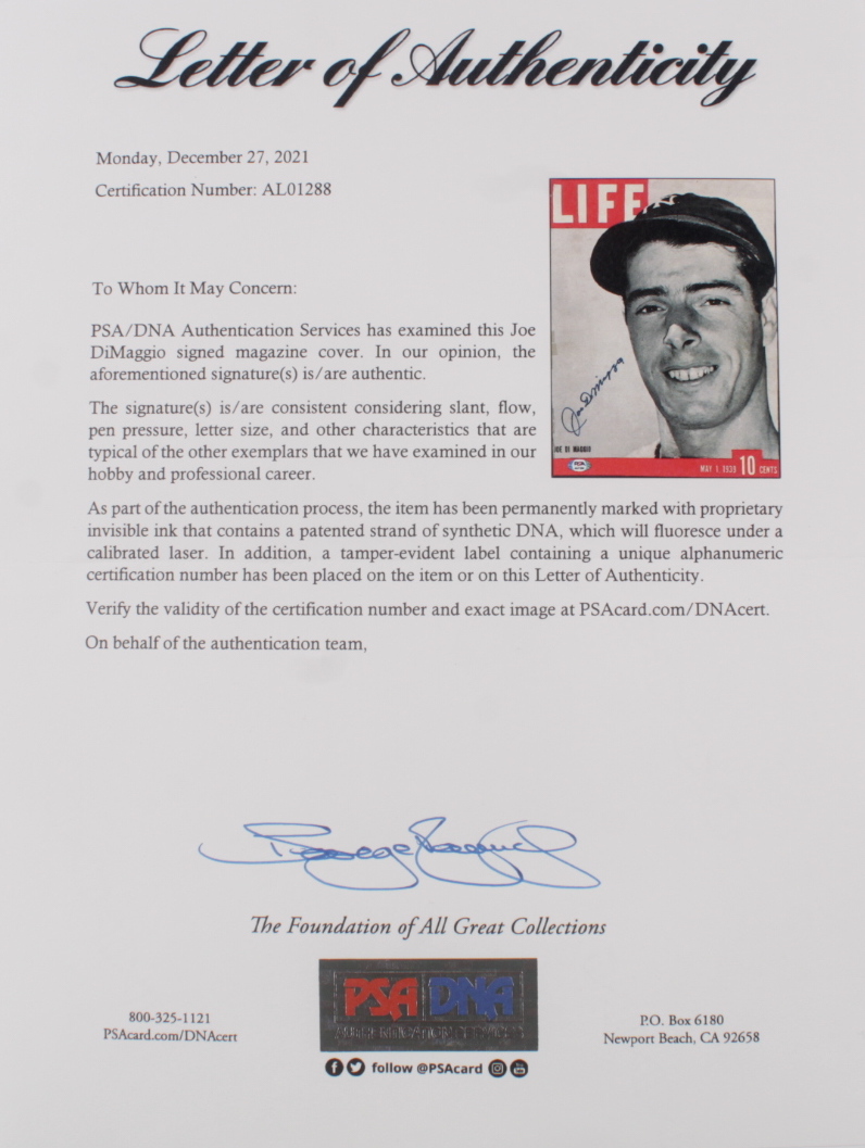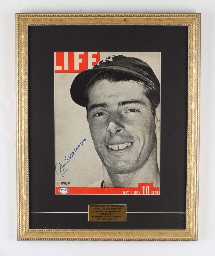 Custom frame measures 16" x 20" in size and features a May 1, 1939, LIFE magazine cover that has been hand-signed by Joe DiMaggio (D. 1999, HOF). Please see photos for the condition of the item.