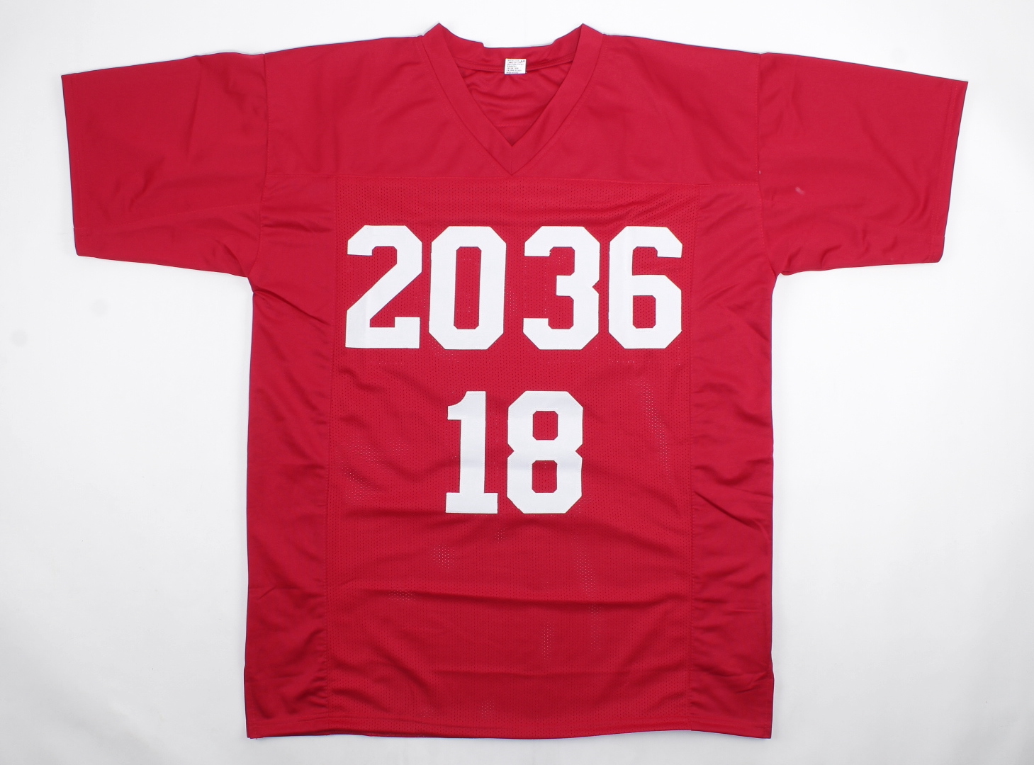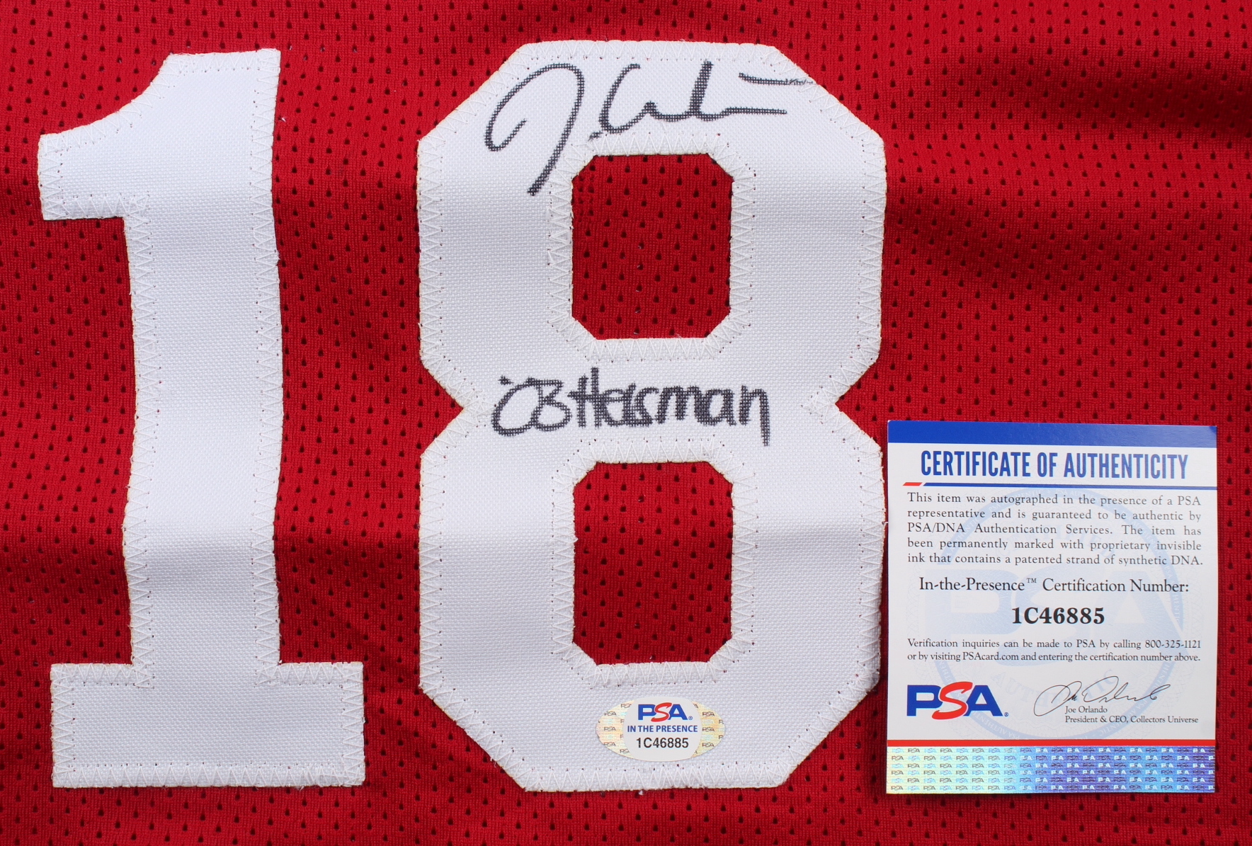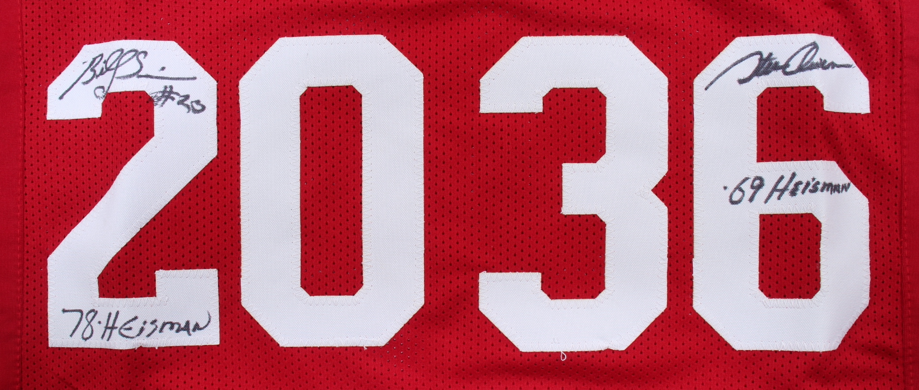 Custom on-field style jersey. Everything is sewn on, size XL. Hand-signed and inscribed by (3) including Billy Sims, Steve Owens and Jason White.