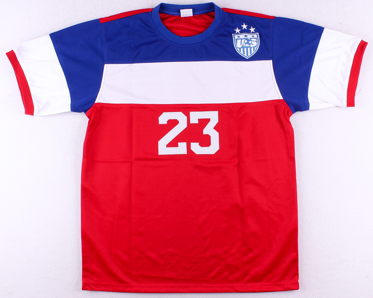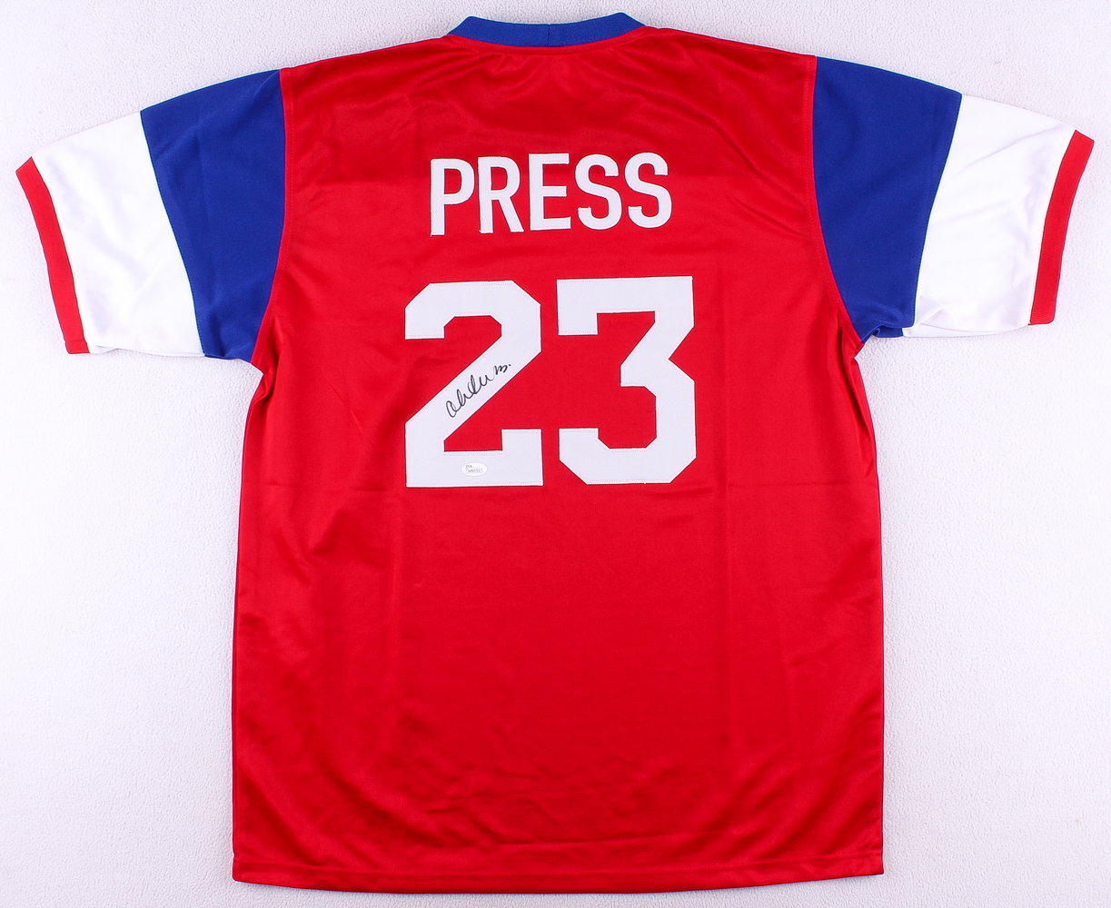 Custom on-field style jersey. Everything is sewn on, size XL. Hand-signed in black felt tip pen by Christen Press.