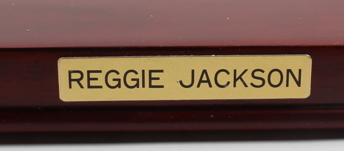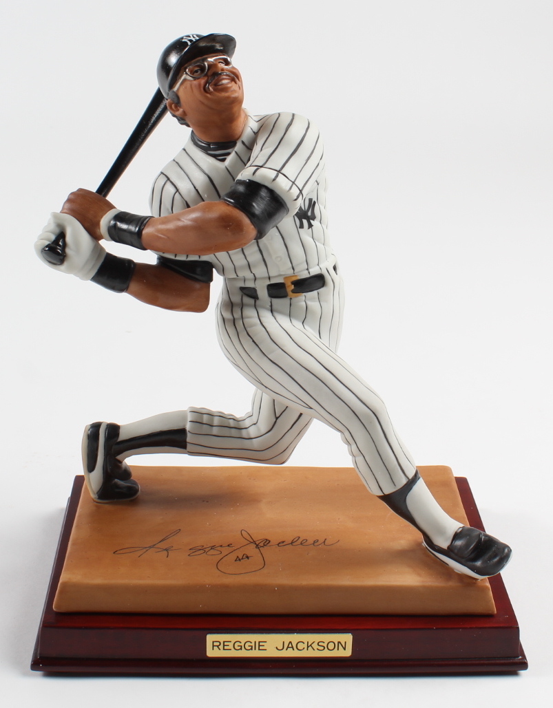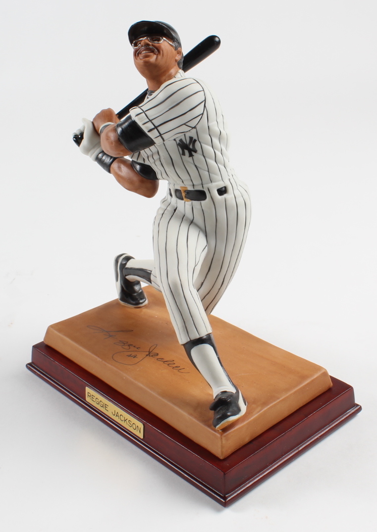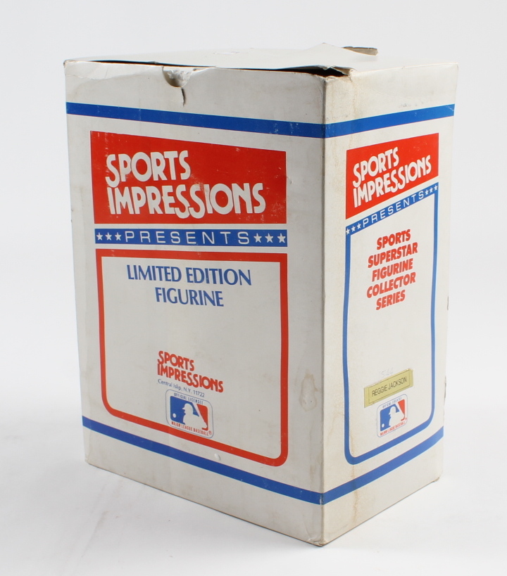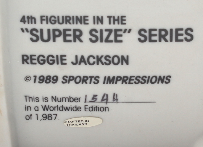 MLB Sports Impressions Reggie Jackson New York Yankees hand-painted porcelain action figure measures approximately 8" in height. Includes display base and original packaging as shown. Limited edition #1544/1987. Please note, signature is a facsimile.