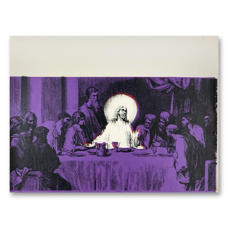 "Jesus Last Supper Purple" is a limited edition hand pulled silkscreen mixed media on canvas by Andy Warhol protege Steve Kaufman (1960-2010). This piece is numbered and #23/200 and hand signed inverso. Includes letter of authenticity. As is common with Kaufman's works, this piece may have perceived minor flaws, but is in overall good condition. Measures approximately 17.7" x 22.7" (image).