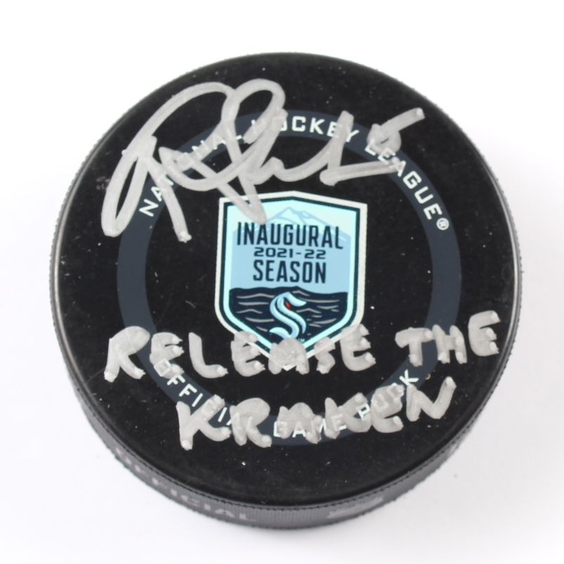 Reilly Sheahan Signed Kraken Logo Hockey Puck Inscribed "Release the Kraken" (Fanatics Hologram)