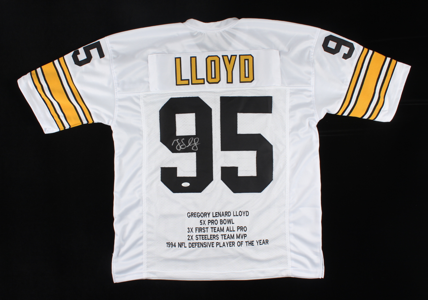 Custom on-field style jersey. Everything is sewn on, size XL. Hand-signed by Greg Lloyd Sr. Lloyd Sr.'s career stats are custom stitched onto the back of the jersey below the reverse numbers.