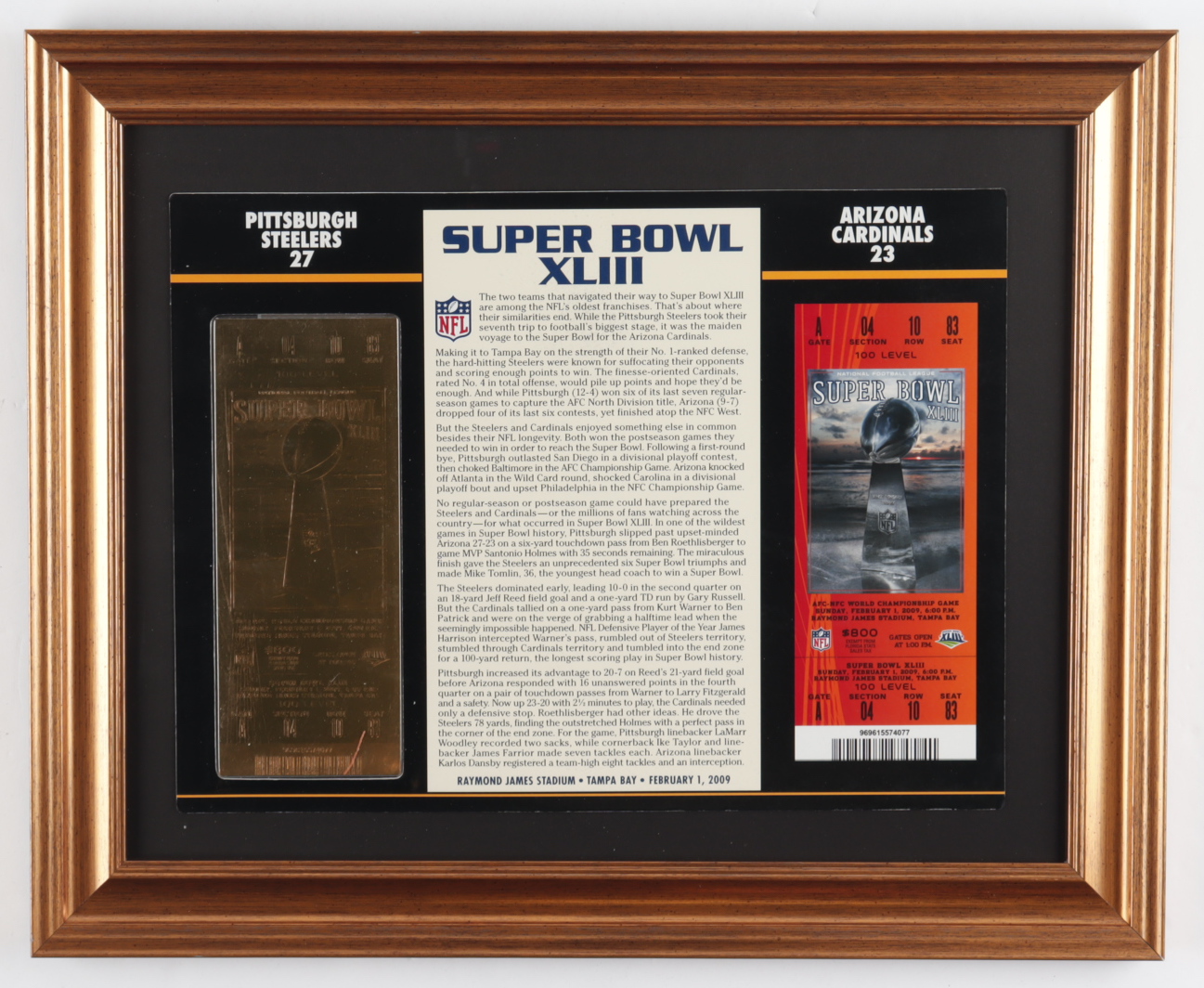 Custom framed display measures 13" x 16" in size. Features an Official Super Bowl XLIII scorecard with a 23kt gold ticket and a replica ticket. Please see photos for the condition of the frame.