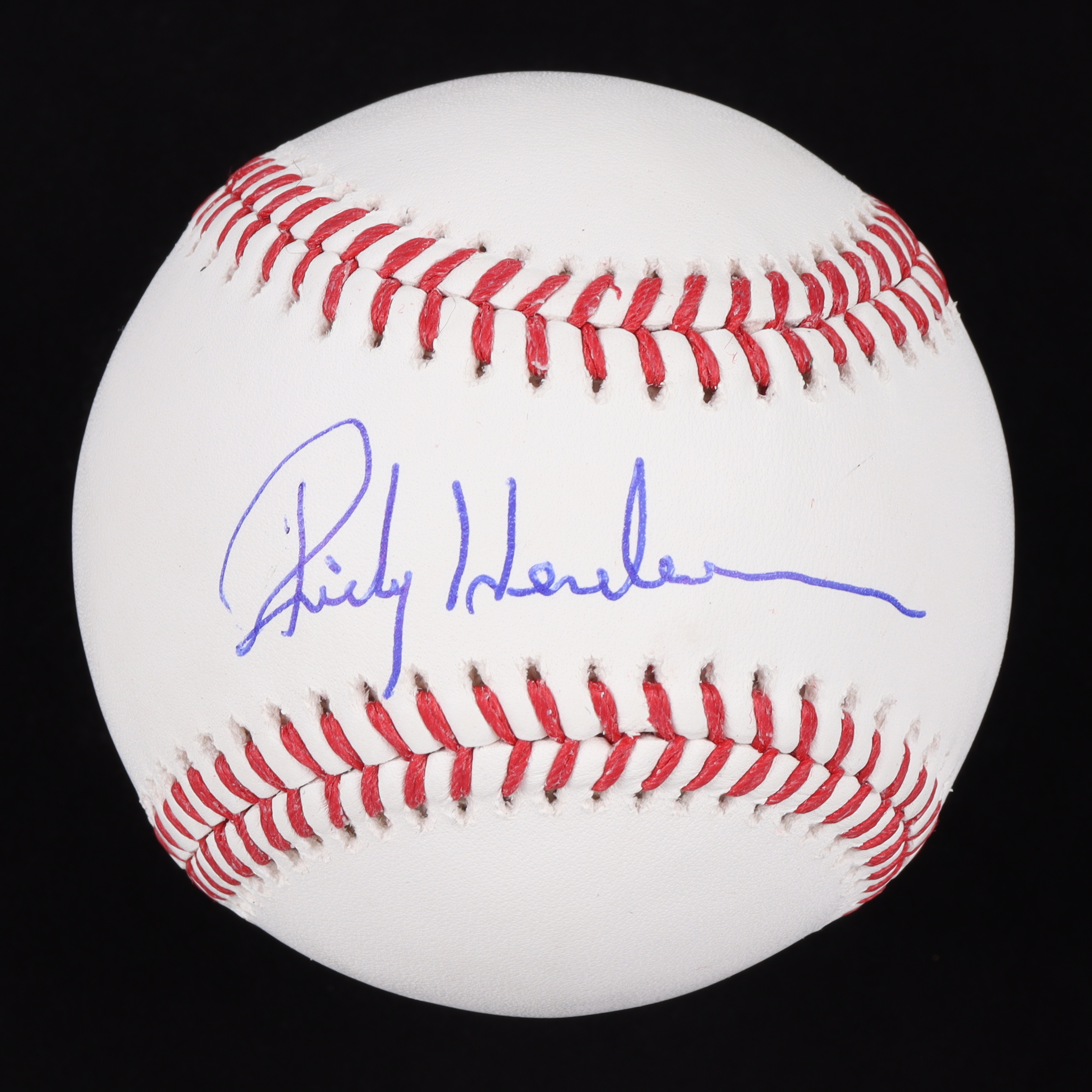 Rawlings Official Major League Baseball. Hand-signed by Rickey Henderson (Oakland Athletics, HOF). Includes display case as shown.