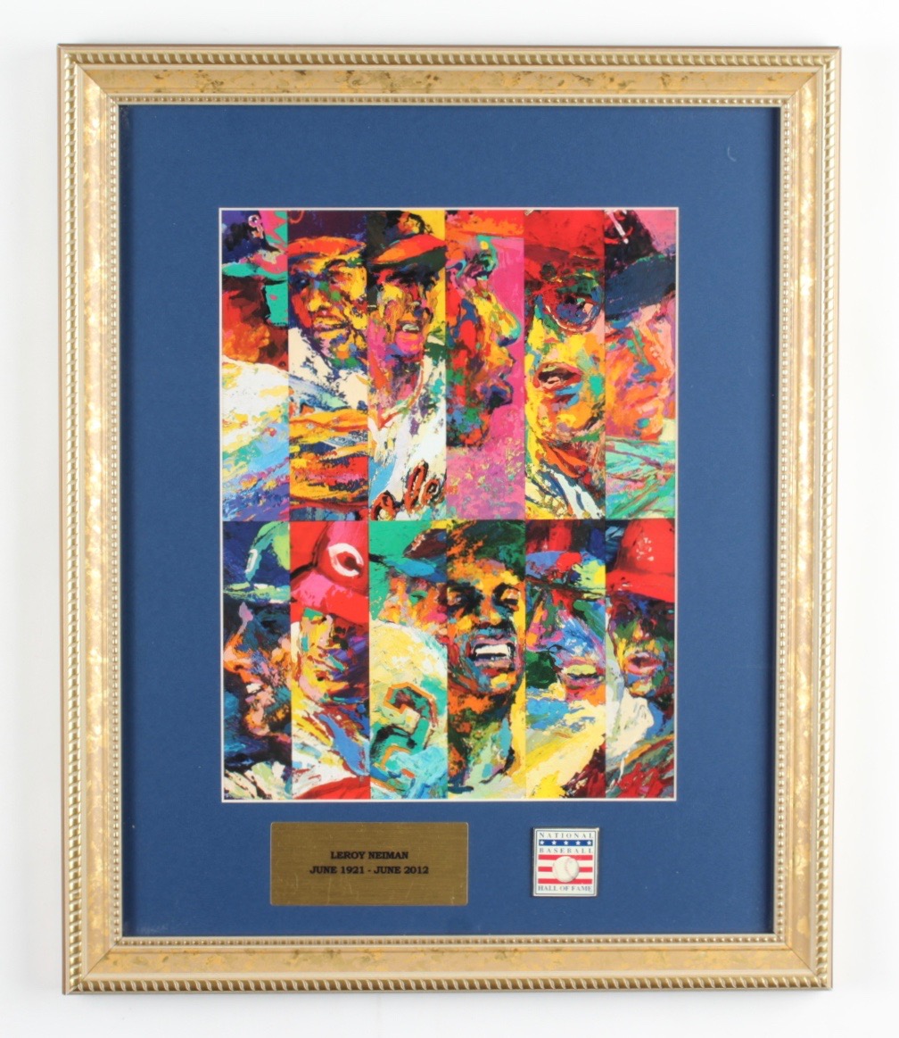 Custom frame measures 17" x 24" in size and features a prints by LeRoy Neiman (D. 2012). Display also features a baseball Hall of Fame pin. Please note, the frame is not signed.