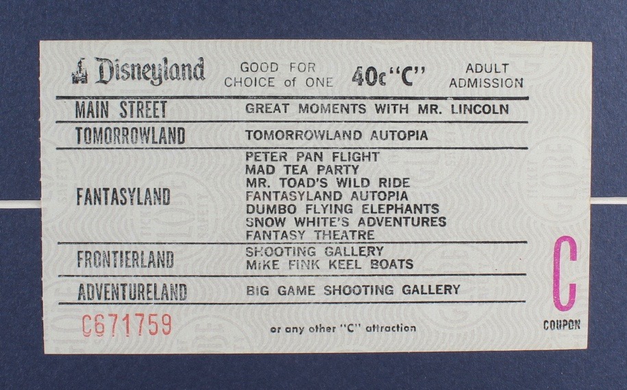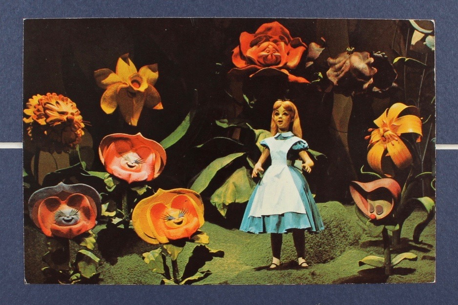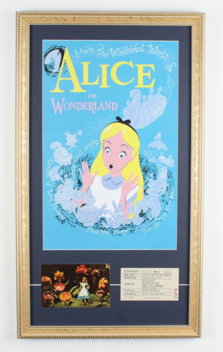 Disneyland's "Alice in Wonderland" 15x26 Print Display with Vintage 'C' Ride Ticket & Postcard