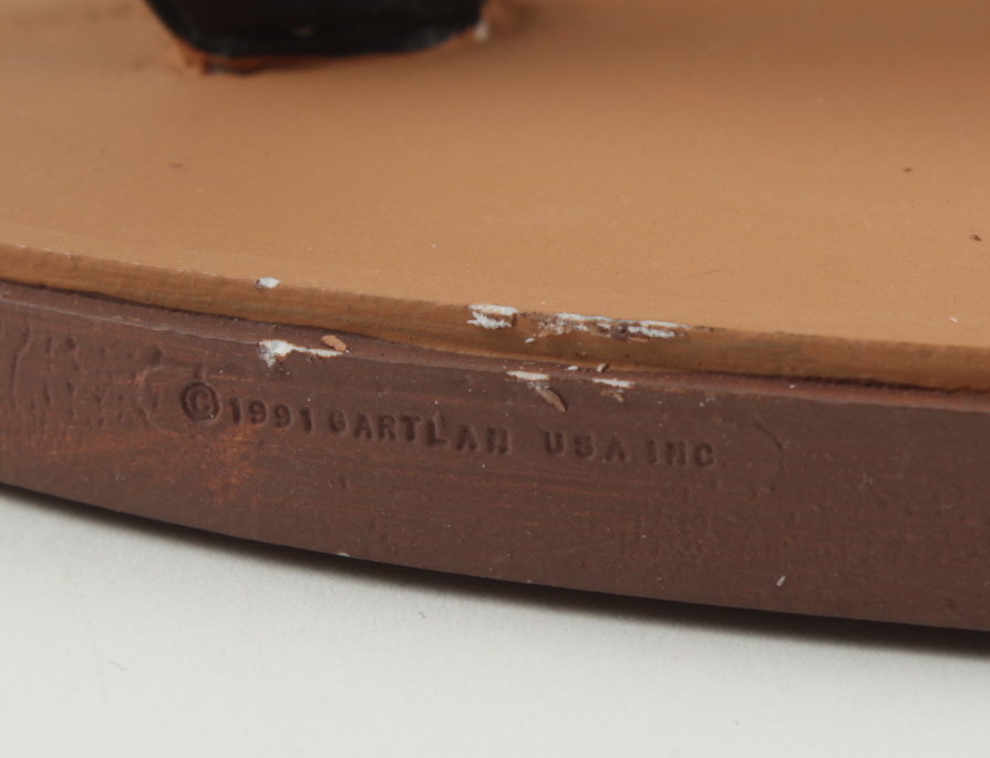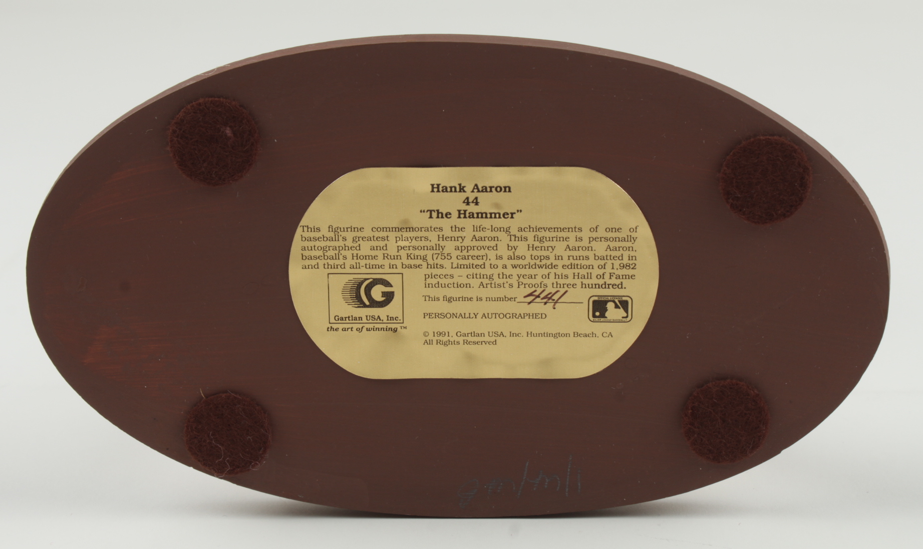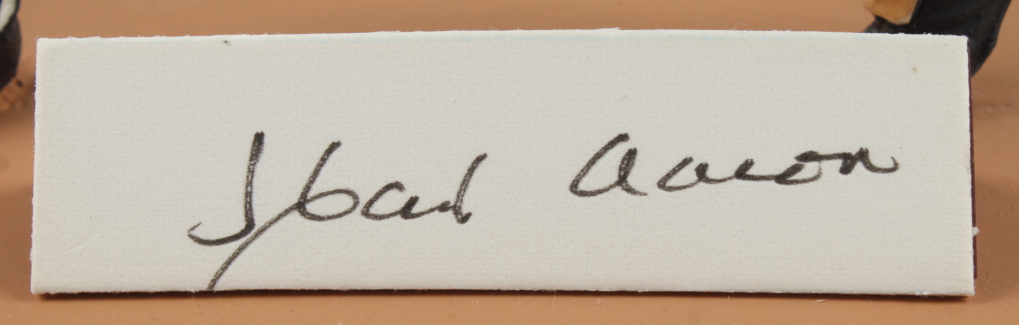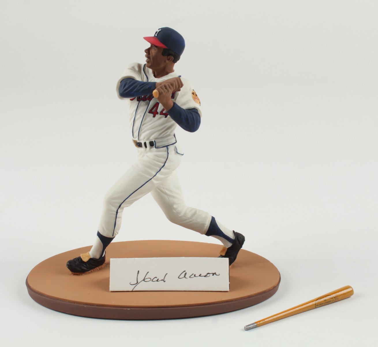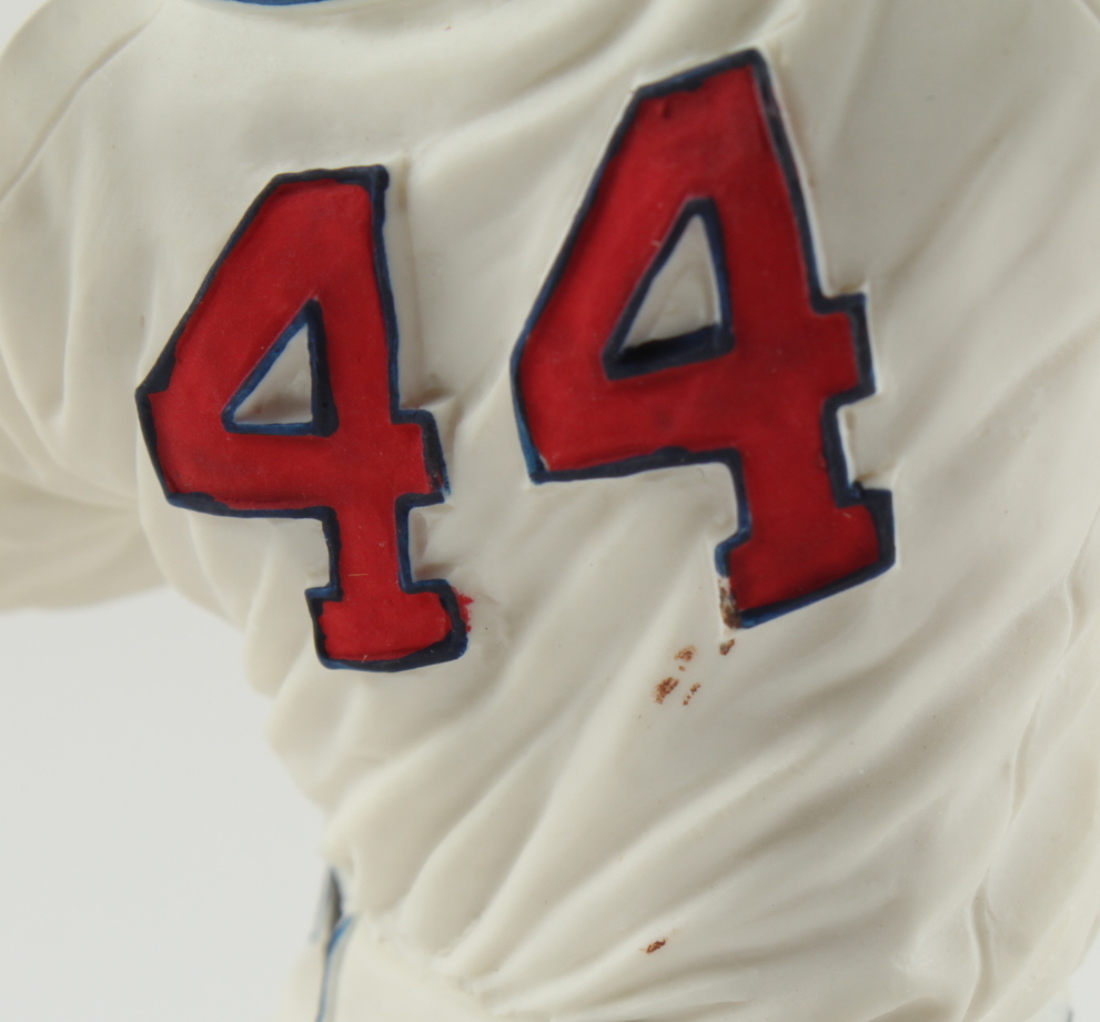 Gartlan ceramic figure measures approximately 8" in height. Features a cut that has been hand-signed by Hank Aaron (D. 2021, Milwaukee Braves, HOF). This ceramic statue is limited edition and has been hand-numbered #441/1,982. Please note, there are flaws in the painting on the back of the jersey as well as signs of wear on the base. See photos for more details.