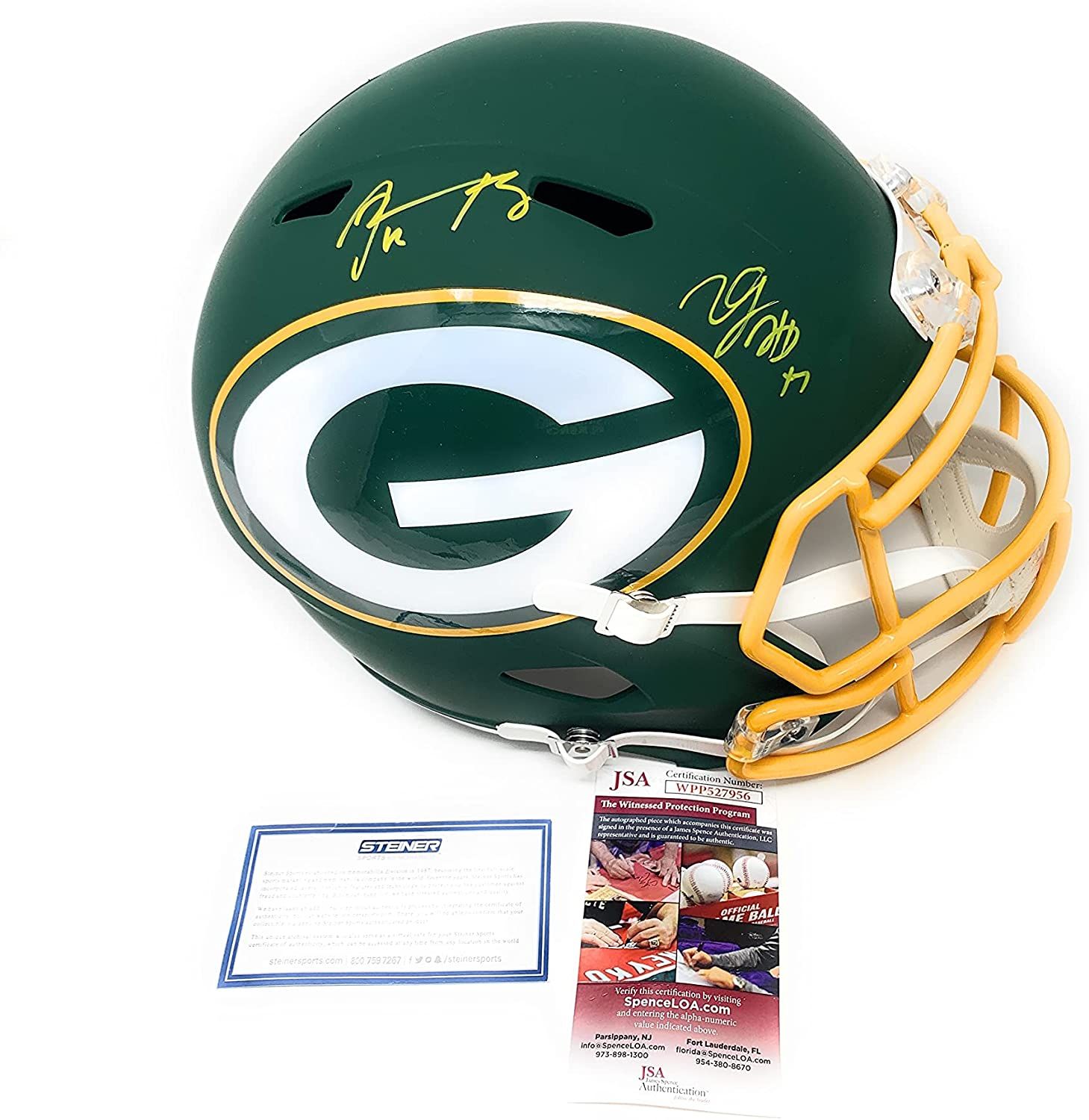 Riddell Green Bay Packers full-size replica AMP Alternate Speed helmet. Hand-signed by Aaron Rodgers and Davante Adams.