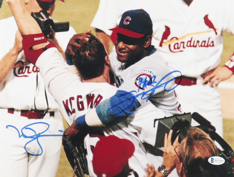 Photo measures 11" x 14" in size and has been hand-signed by Mark McGwire (St. Louis Cardinals) and Sammy Sosa (Chicago Cubs).