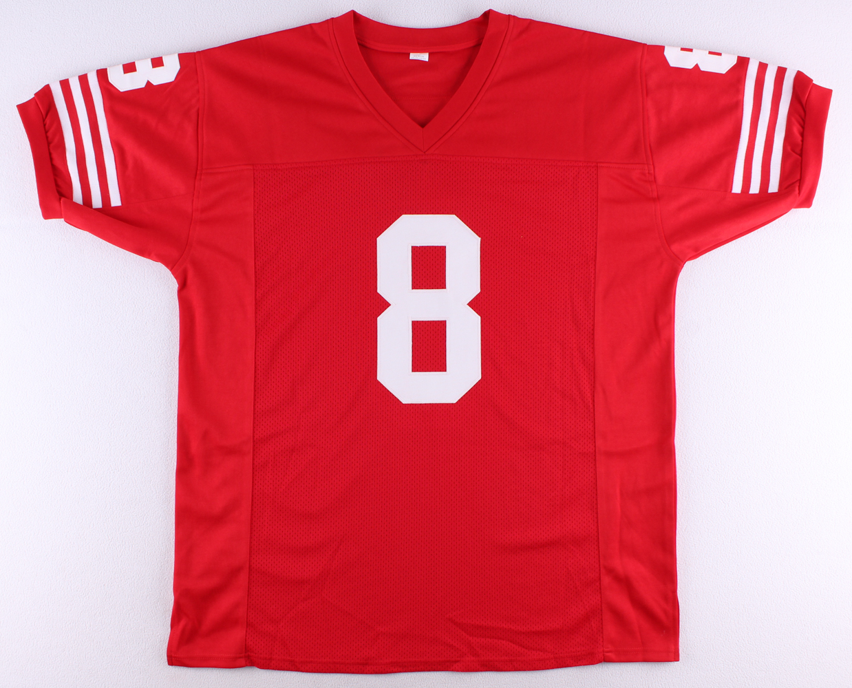 Custom on-field style jersey. Everything sewn on, size XL. Hand-signed and inscribed in black felt-tip pen by Steve Young (HOF).