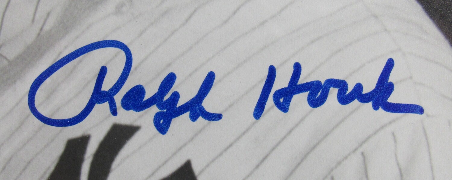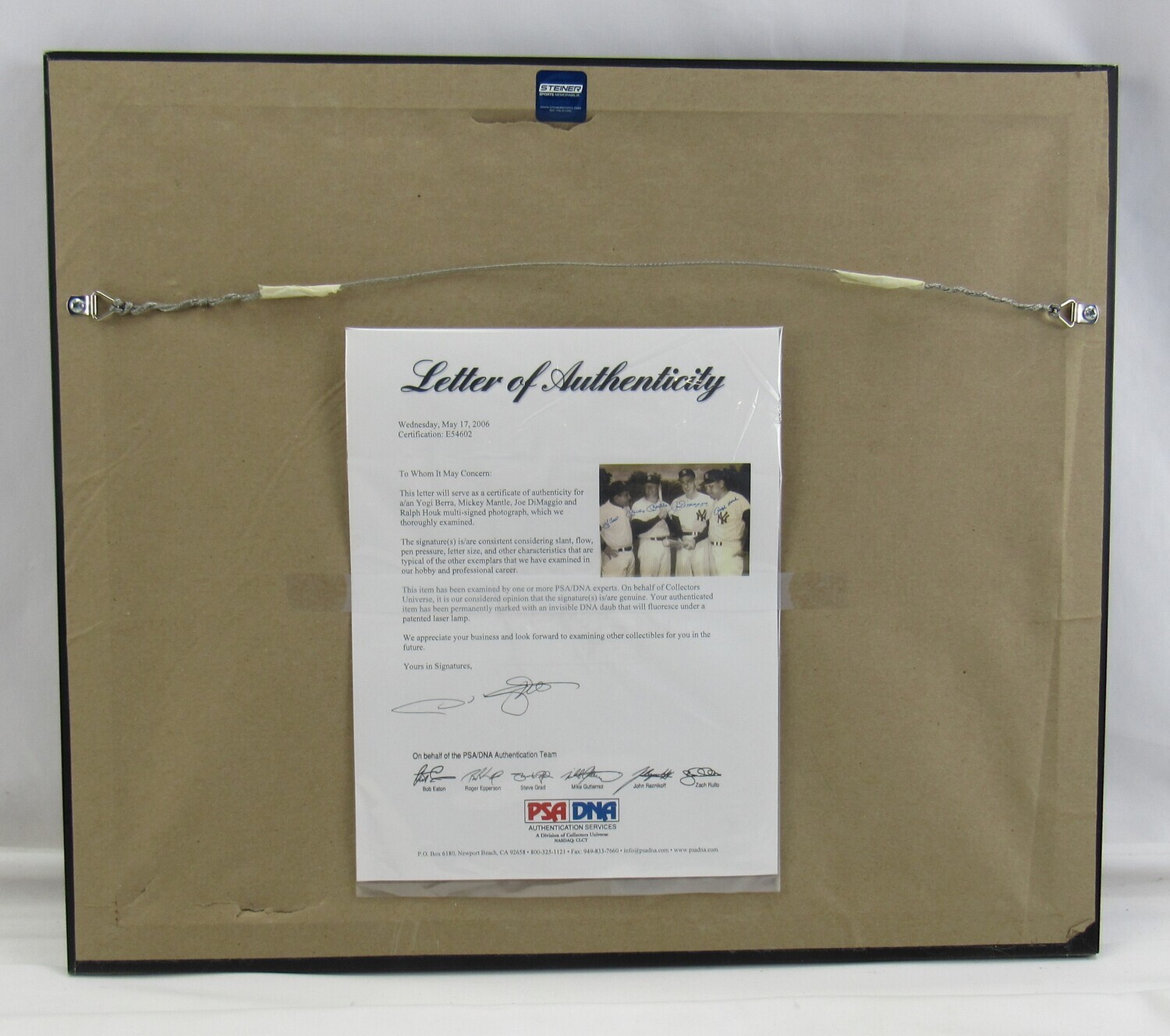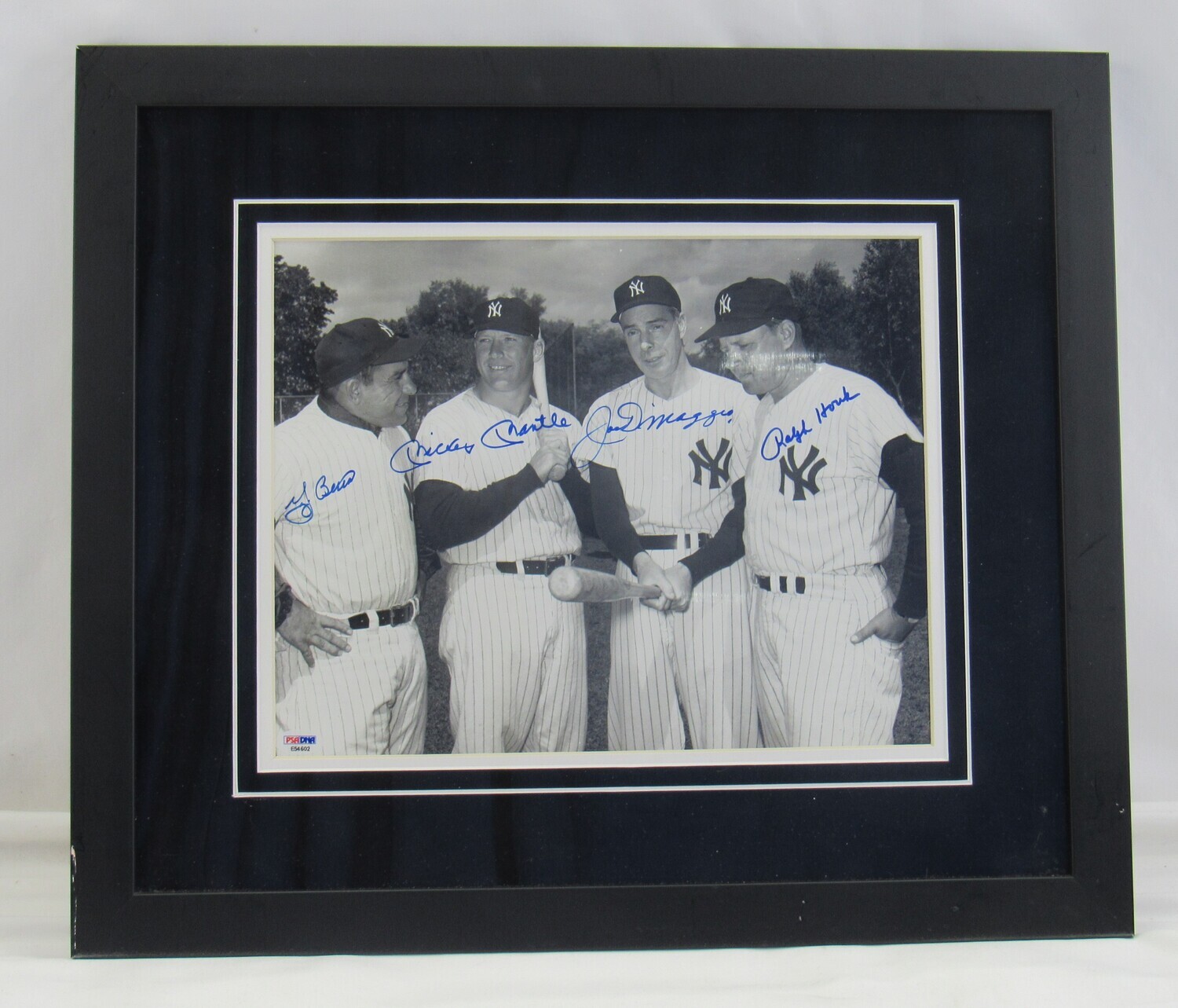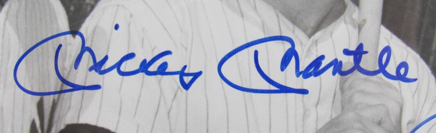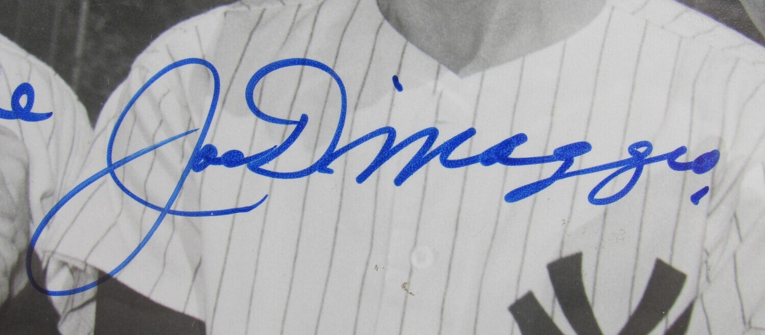 Custom frame measures approximately 18" x 21" in size and features a photo that has been hand-signed by Mickey Mantle (D.1995, HOF), Joe DiMaggio (D.1999, HOF), Yogi Berra (D.2015, HOF) and Ralph Houk (D.2010).